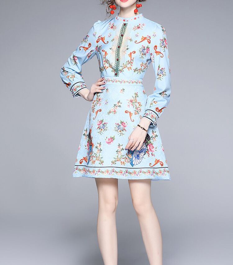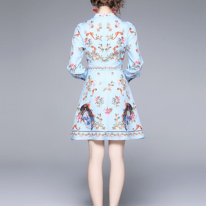 Pinkoz プラス サイズの女性の膝丈ドレス ブルー花柄プリントシャーリング A ライン春夏シックな休日ドレス traf 自由奔放に生きる vestidos ピンク 大きめサイズ スプリング 春物 サマー 夏物 Aライン
