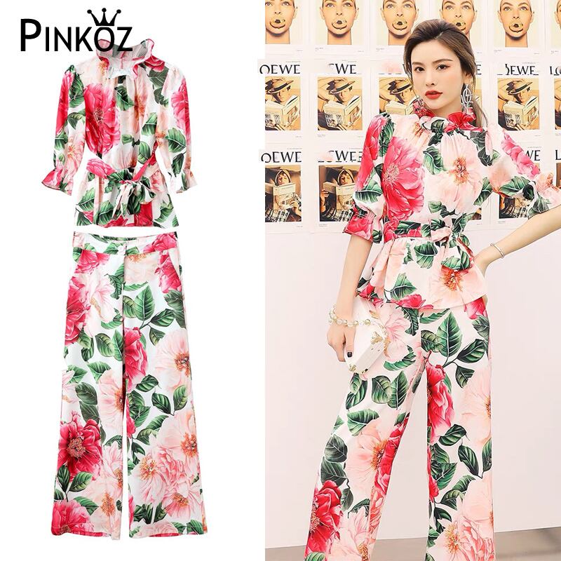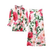 Pinkoz ローズフラワー 2点セット レディース レッド 花柄 エレガント トップス ブラウス レディース + ロング ワイドレッグ パンツ セット スーツ カジュアル 大きいサイズ 2XL ピンク 大きめサイズ ワイドパンツ フラワーデザイン