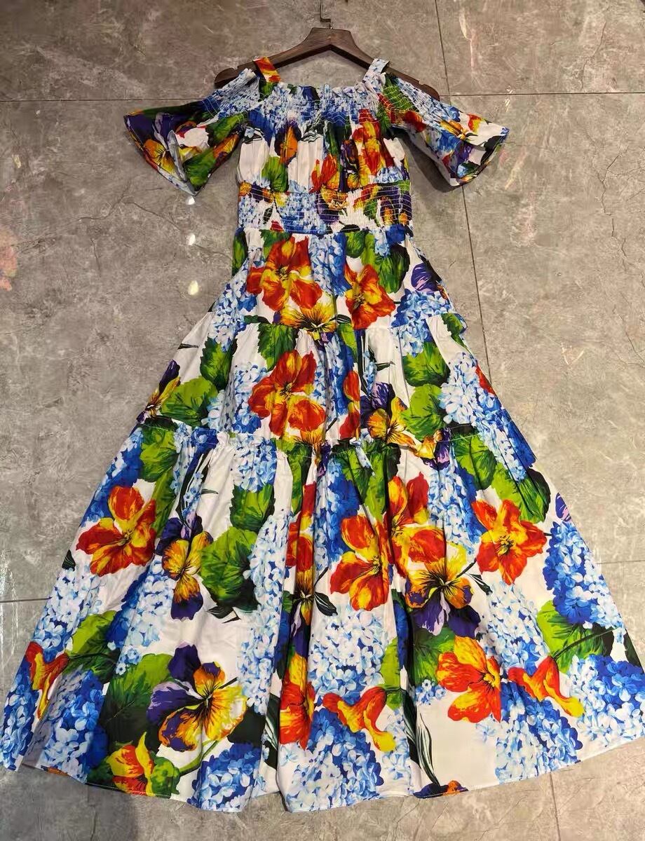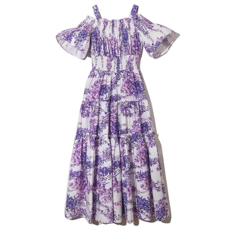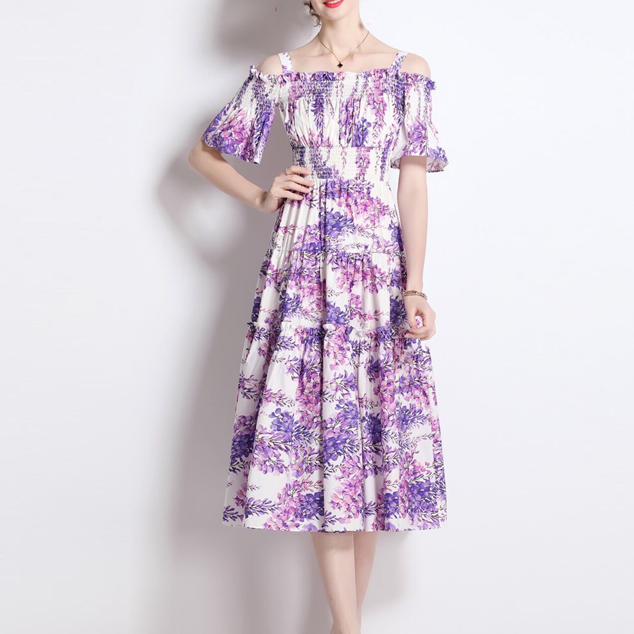 Pinkoz 女性デザイナー パープル花柄プリント スラッシュ ネック弾性ウエスト ロング ドレス スパゲッティ ストラップ A ライン パッチワーク ドレス ヴィンテージ ピンク エラスティック 伸縮 Aライン ビンテージ