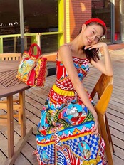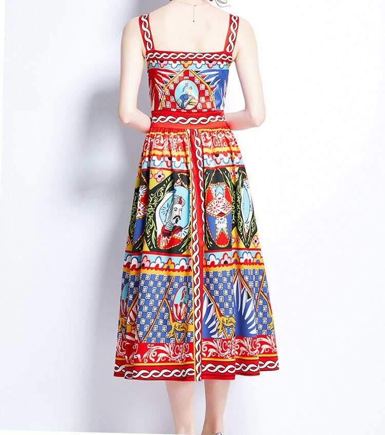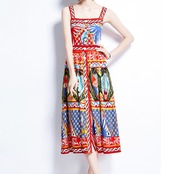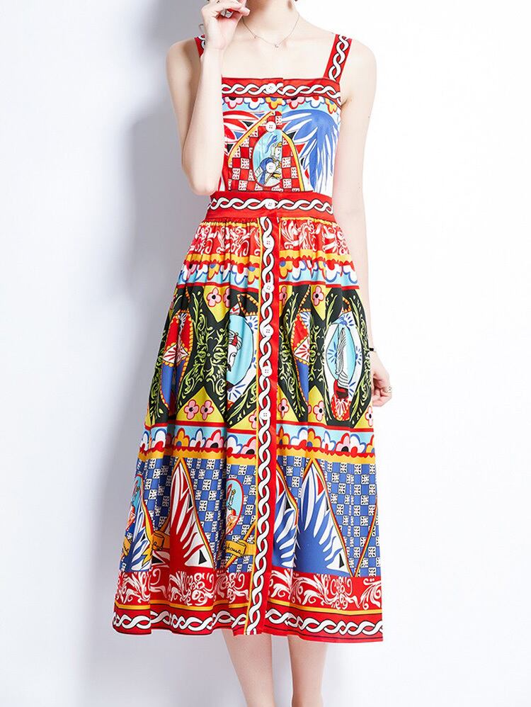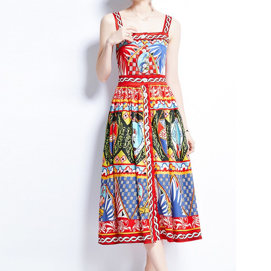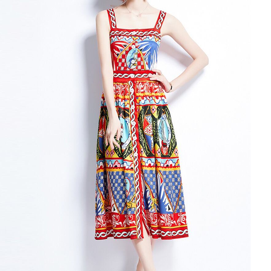 Pinkoz デザイナー女性シングル ブレスト ミディ ドレス スパゲッティ ストラップ ボタン バロック花柄プリント赤と青の格子縞自由奔放に生きるドレス ピンク レッド ブルー