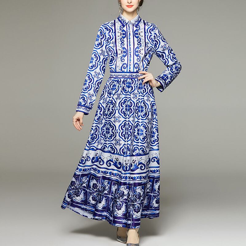 Pinkoz 滑走路デザイナー青と白のターン ダウン襟フル スリーブ ビッグ サイズ マキシ ドレス エレガントなファッション ローブ デ mujer vestidos ピンク ホワイト ブルー