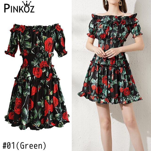 Pinkoz デザイナーの女性のミニドレススラッシュネックオフショルダーフリルレッドローズフラワープリント弾性ウエストドレスカジュアル自由奔放に生きる ピンク エラスティック 伸縮 フラワーデザイン
