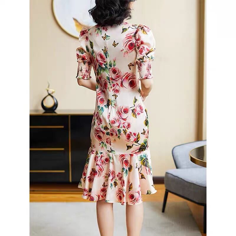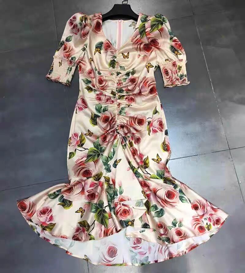 Pinkoz セクシーな女性マーメイド ドレス ピンク ローズ フラワー プリント フォールド フリル ビーズ v ネック サテン ショート パーティー ドレス夏新 ラッフル サマー 夏物 Vネック フラワーデザイン
