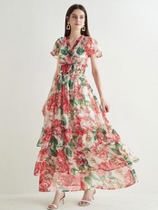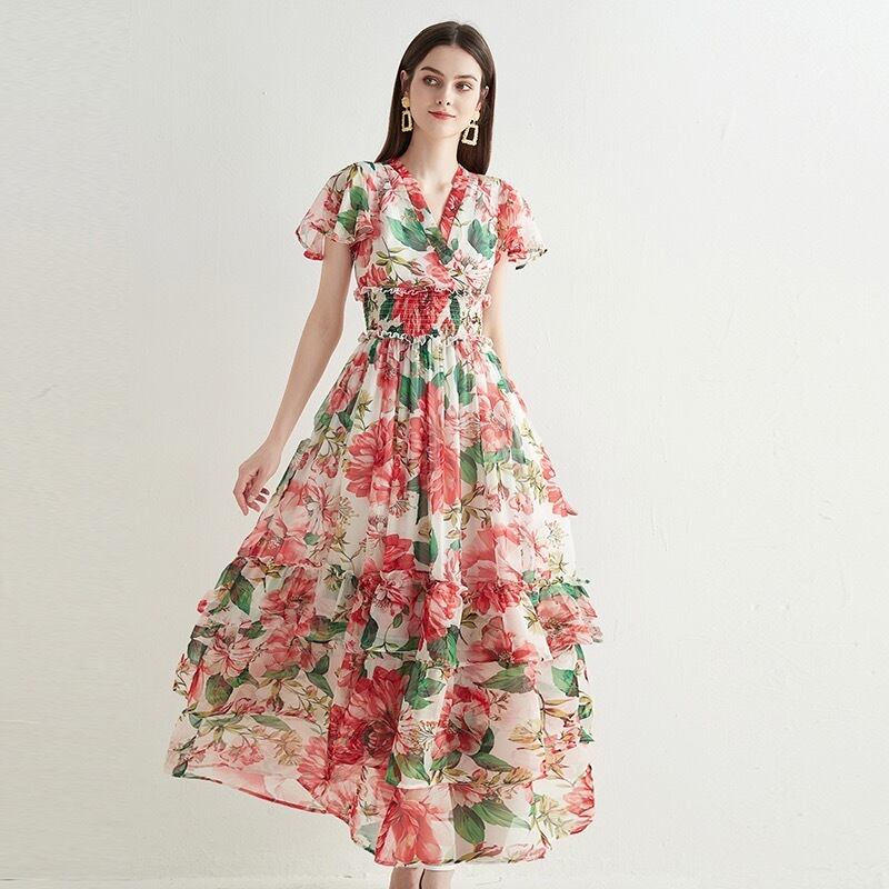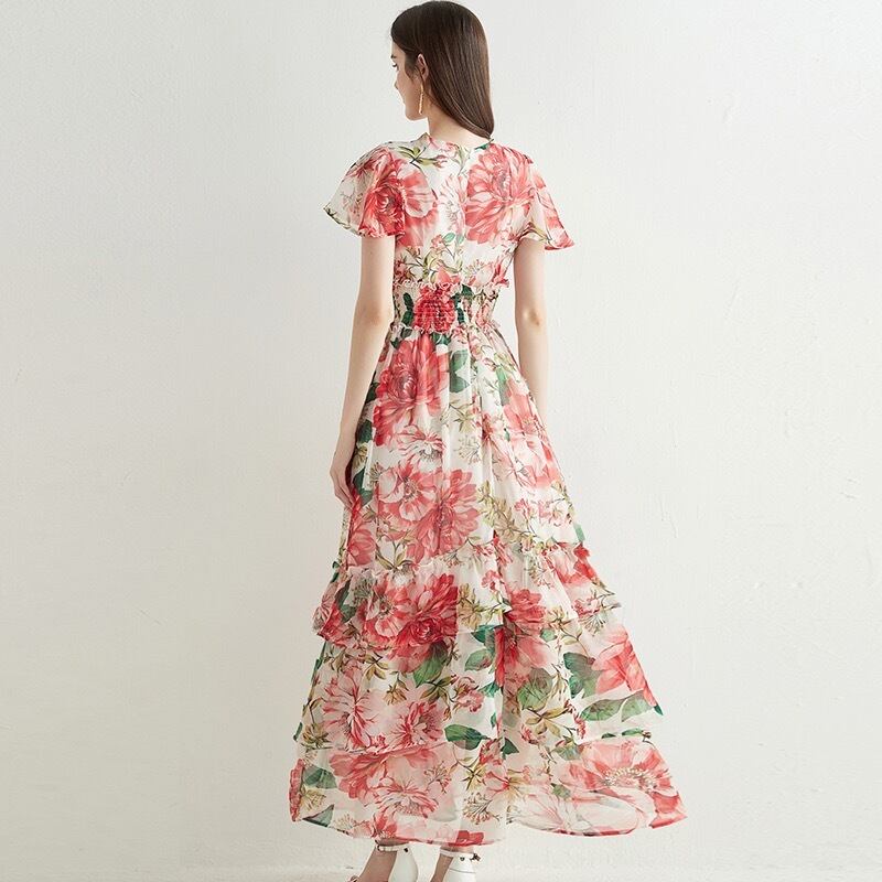 Pinkoz 高級赤い花プリント v ネック マキシ ドレス女性フリル パーティー ロング サマー ドレス フェスティバル服新 ピンク レッド 夏物 Vネック フラワーデザイン