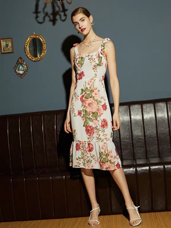 Pinnkoz ヴィンテージビーチドレス女性花自由奔放に生きる mid ドレスローズフラワープリントスパゲッティストラップレースアップホリデーカジュアルドレス 花柄 フラワーデザイン ビンテージ