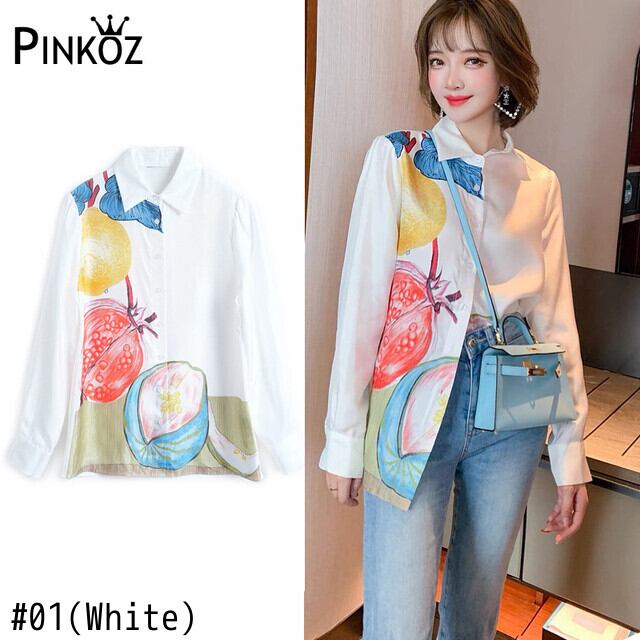 Pinkoz カジュアル女性シャツ白塗装ターンダウン襟フルスリーブシングルブレストエレガントなオフィスレディブラウストップス女性 y2k ピンク ホワイト 会社 学校 通勤や通学にも