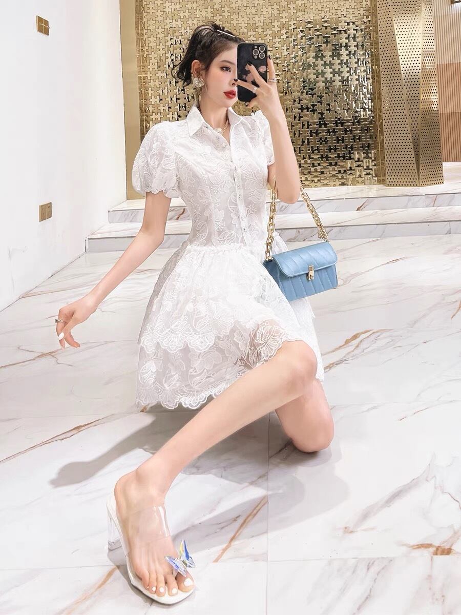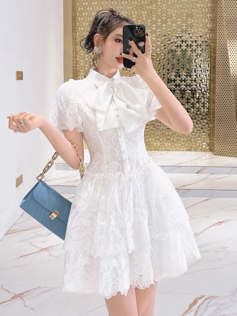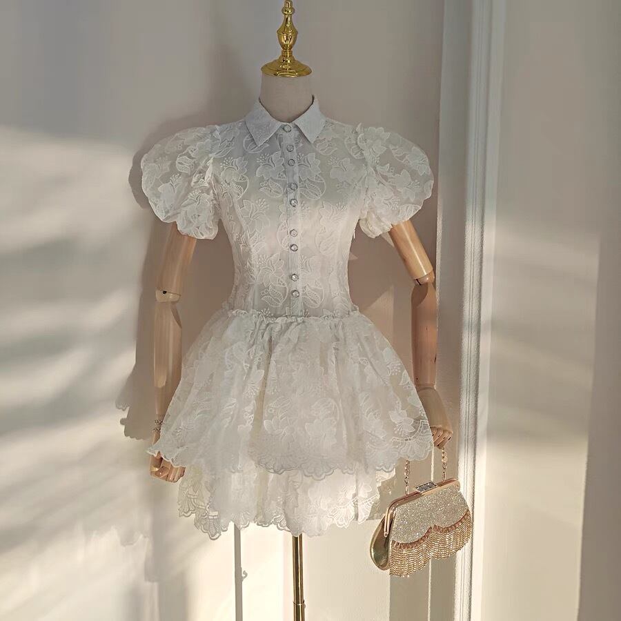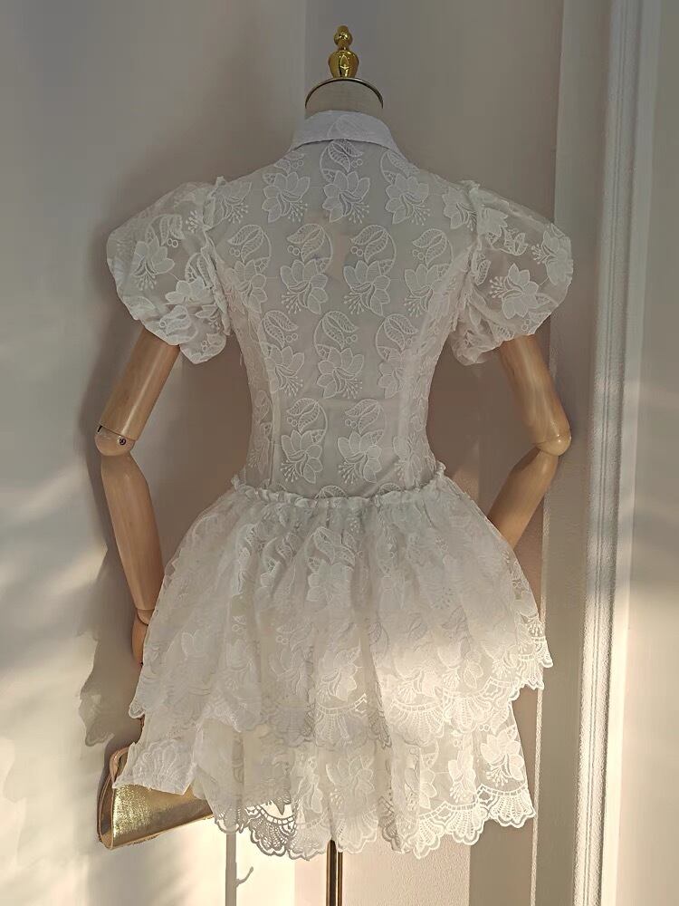 Pinkoz 滑走路春夏の妖精ミニドレス女性ホワイト中空アウトシングルブレストレースパーティードレス Vestidos ピンク スプリング 春物 サマー 夏物