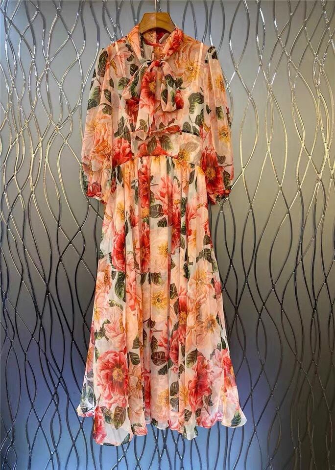 Pinkoz 滑走路デザイナー シフォン ソフト レッド ローズ フラワー プリント長袖弓襟ローブ パーティー女性マキシ ドレス traf ロング ピンク リボン フラワーデザイン