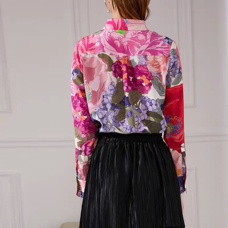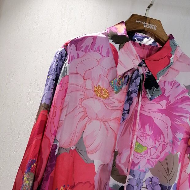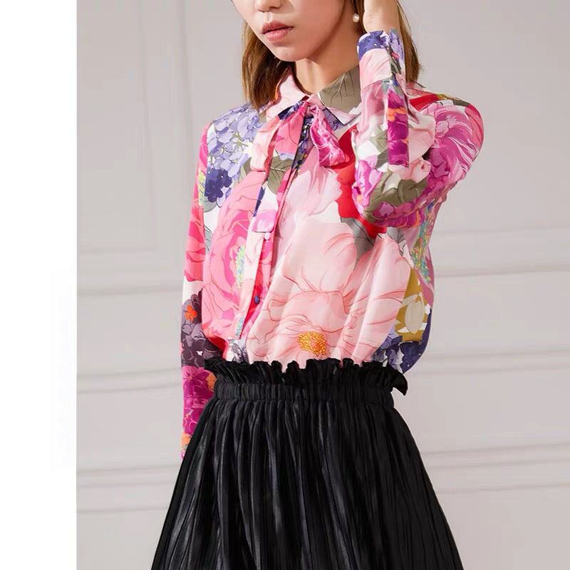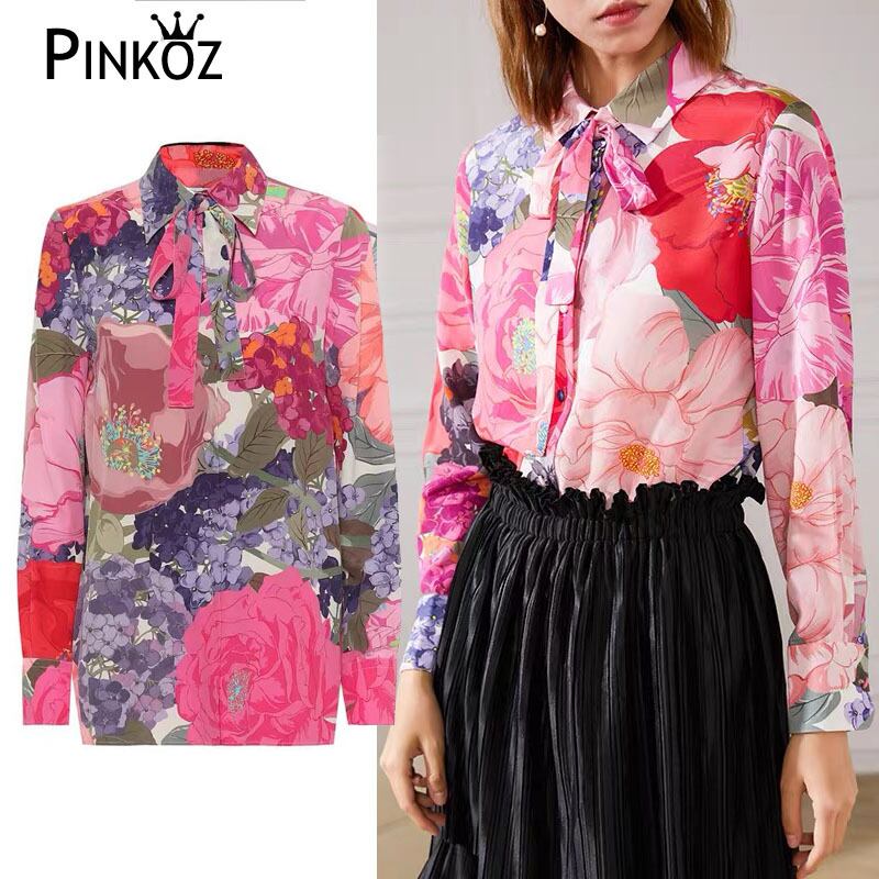 Pinkoz 女性ブラウス長袖弓襟花柄シャツスリムトップブラウスシックなスタイリッシュなロパデ ロング ピンク リボン