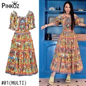 Pinkoz ボヘミア夏綿ドレス女性スパゲッティストラップ弾性ウエスト花柄シャーリング休日 bis サイズ vestidos y2k ピンク コットン エラスティック 伸縮 サマー 夏物