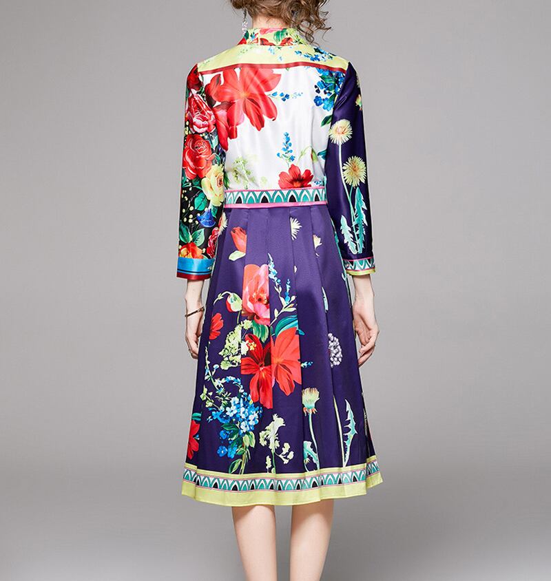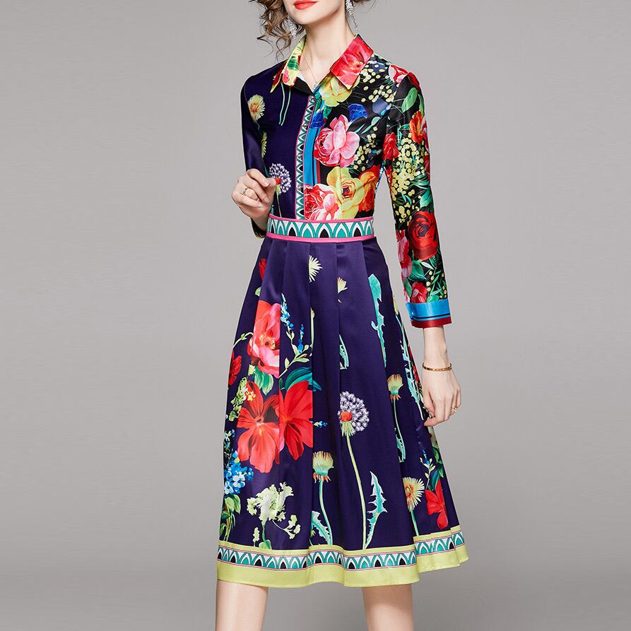 Pinkoz 女性エレガントな花柄ターンダウン襟春秋ミニプリーツドレスハイウエストビッグサイズ vestidos ヴィンテージ za ハイウェスト ピンク スプリング 春物 オータム 秋物 ビンテージ