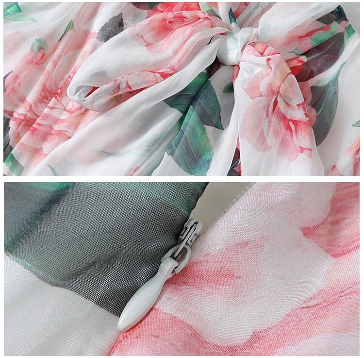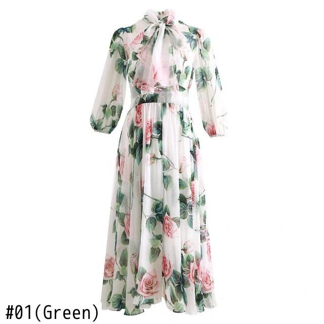 Pinkoz 赤い花の弓の襟シフォン y ドレス女性パーティー カジュアル花柄ドレス Y2K ピンク レッド リボン フラワーデザイン
