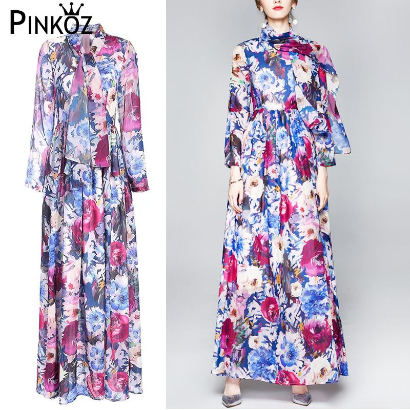 Pinkoz 床の長さの夏の女性の花柄の手首の袖の長いマキシ自由奔放に生きるドレス女性の休日のドレス Vestidos ロング ピンク サマー 夏物