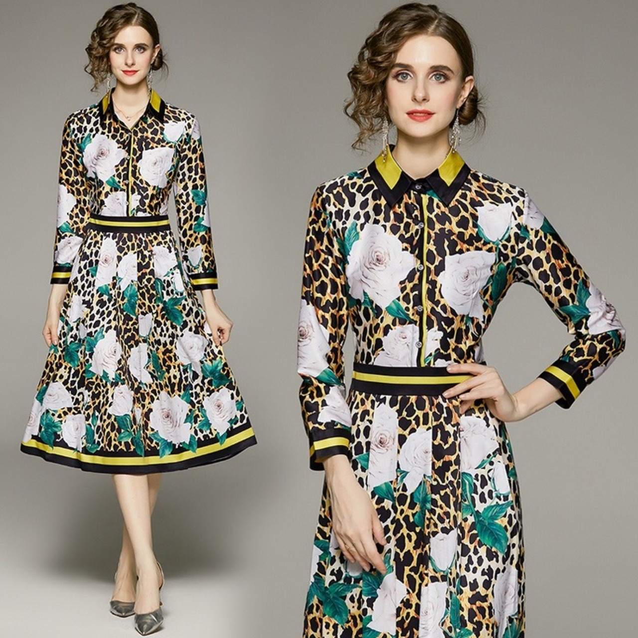 Pinkoz 滑走路デザイナー ターン ダウン襟赤い花プリント A ライン長袖ローブ ホリデー シックなドレス vestidos デ mujer traf ロング ピンク レッド Aライン フラワーデザイン