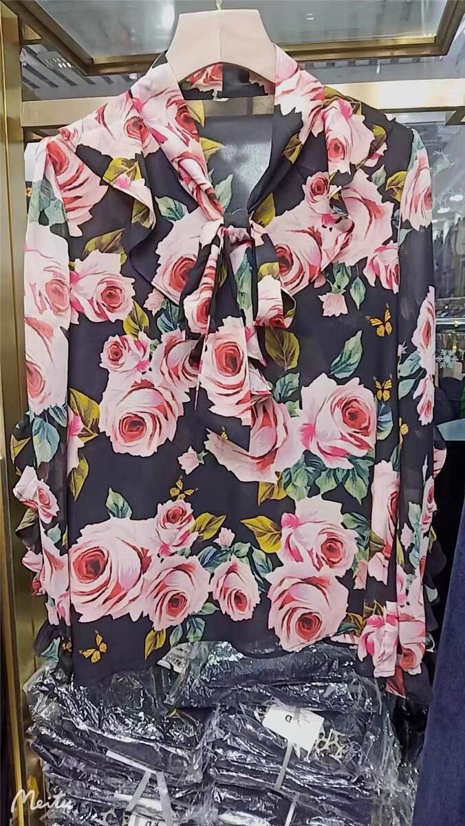 Pinkoz 女性デザイナー ピンク ローズ フラワー プリント ボウ カラー シフォン薄い夏ブラウス ファム ファッション服エレガント シャツ traf リボン サマー 夏物 フェミニン フラワーデザイン