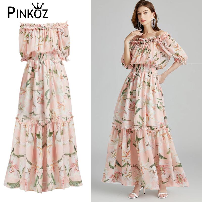 Pinkoz デザイナー ユリの花ピンク マキシ シフォン ドレス女性シャーリング スラッシュ ネック弾性ウエスト自由奔放に生きる a ライン カジュアル女性大新 エラスティック 伸縮 Aライン フラワーデザイン