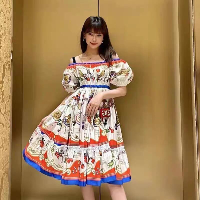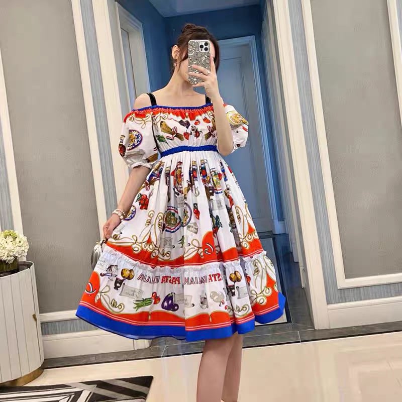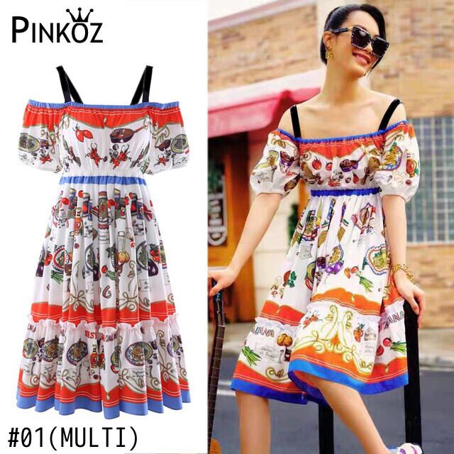 Pinkoz 夏滑走路バケーションドレス女性のスパゲッティストラップレターフラワープリントパフスリーブ A ラインドレス Vestidos Traf ピンク サマー 夏物 Aライン フラワーデザイン