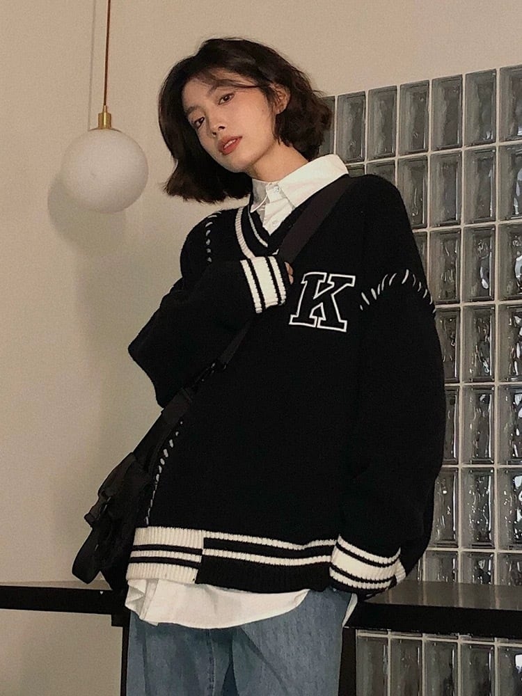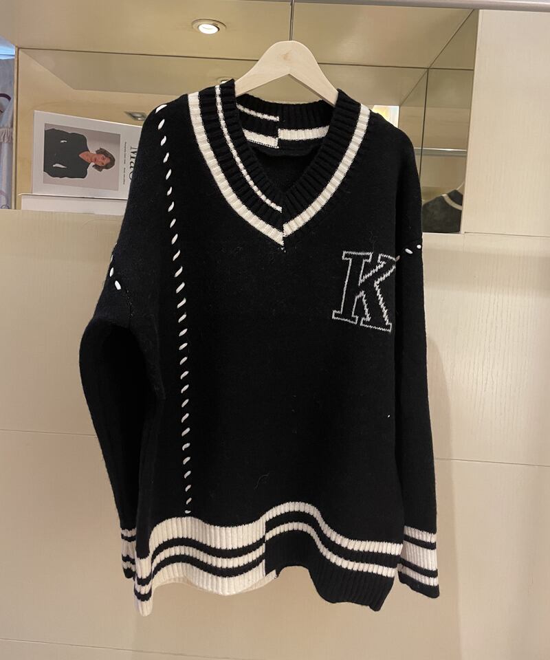 Pinkoz 女性の冬の高級プルオーバー V ネックストライプ文字刺繍長袖ルーズセーターニットトップス ロング ピンク ウィンター 冬物 Vネック
