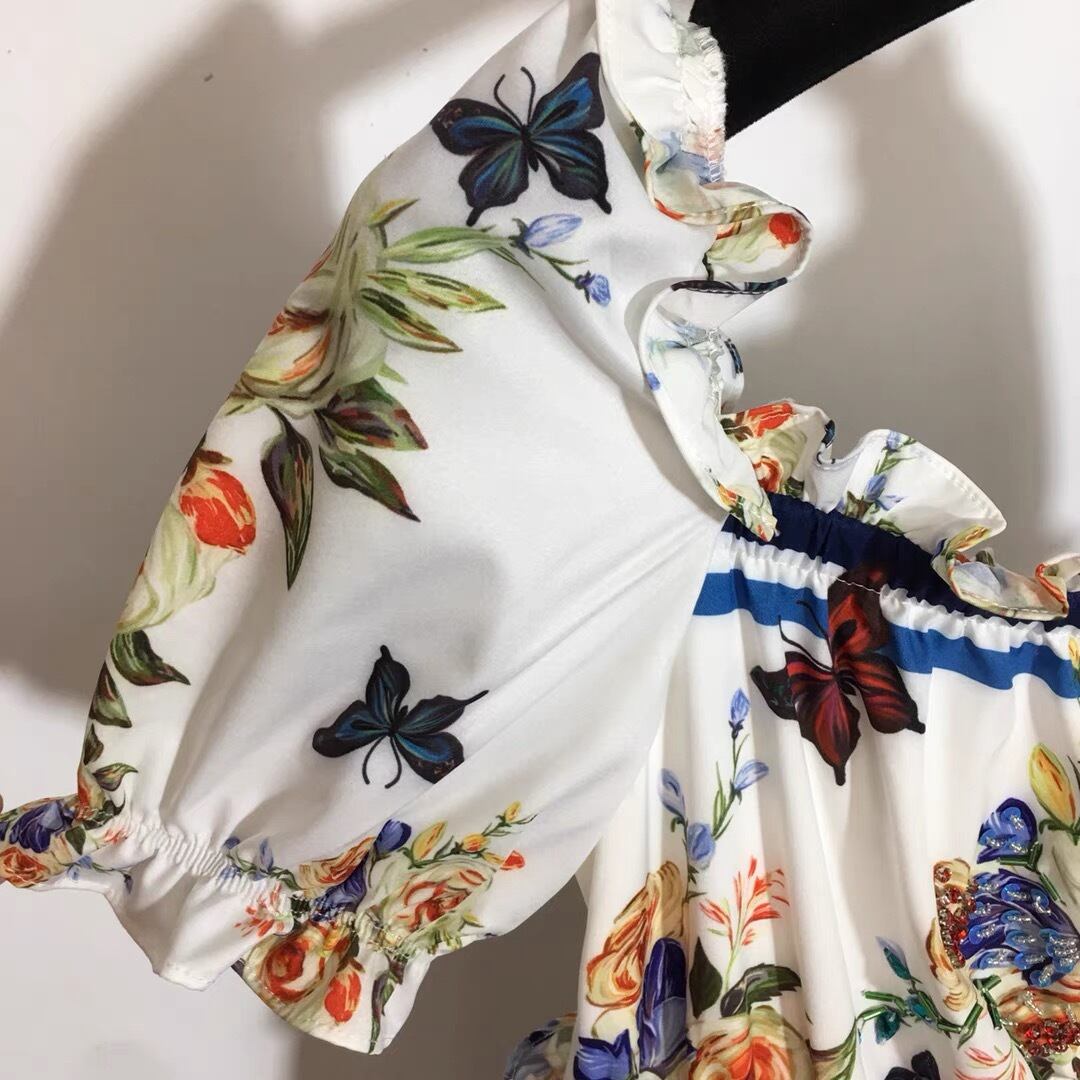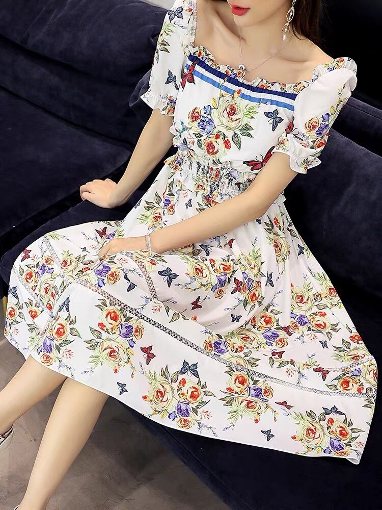 Pinoz デザイナー スタイル シャーリング スクエア カラー夏休みミディ ドレス フラワー プリント パッチワーク ハイ ウエスト ドレス ファム vestidos ハイウェスト サマー 夏物 フェミニン フラワーデザイン スクウェア