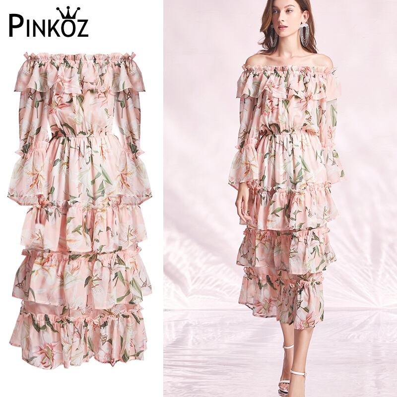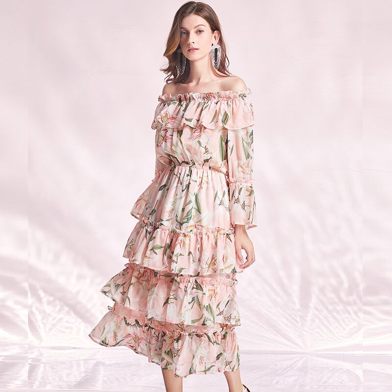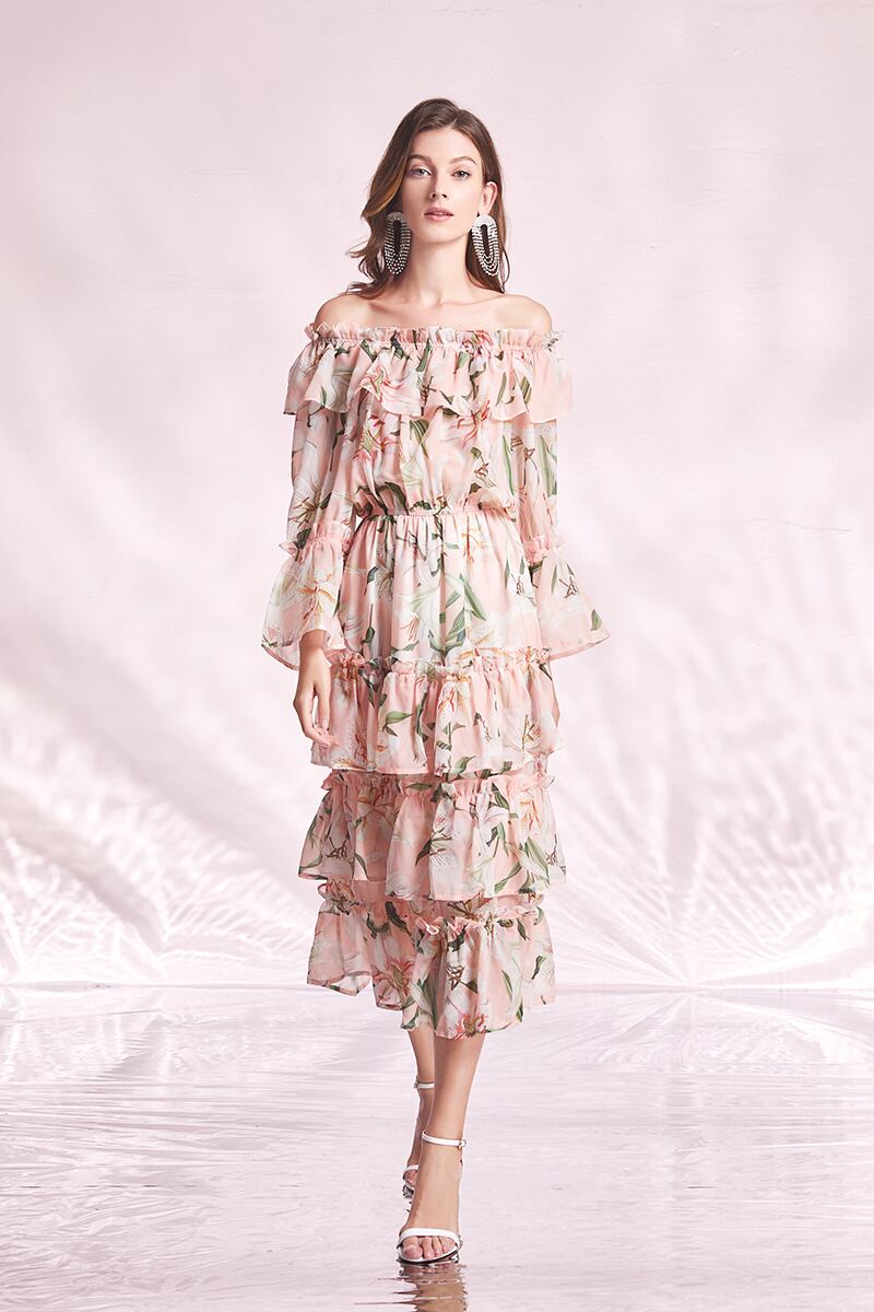 Pinkoz ピンクのユリの花がプリントされたレイヤード ミディ ドレス スラッシュ ネック オフ ショルダー 弾性ウエスト パーティー ホリデー ビーチ ドレス トラフ ローブ レッド エラスティック 伸縮 フラワーデザイン