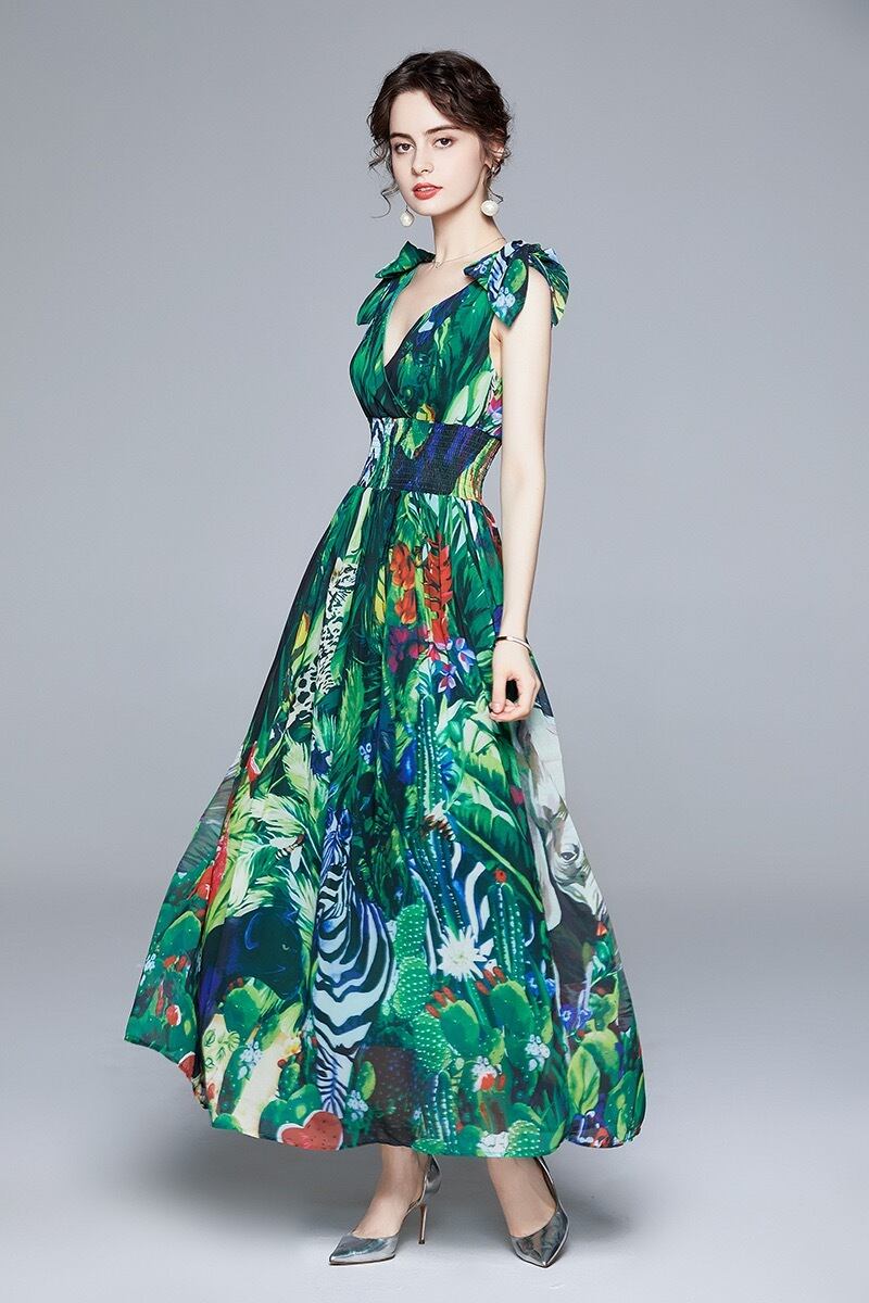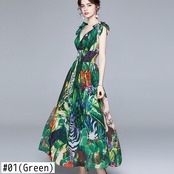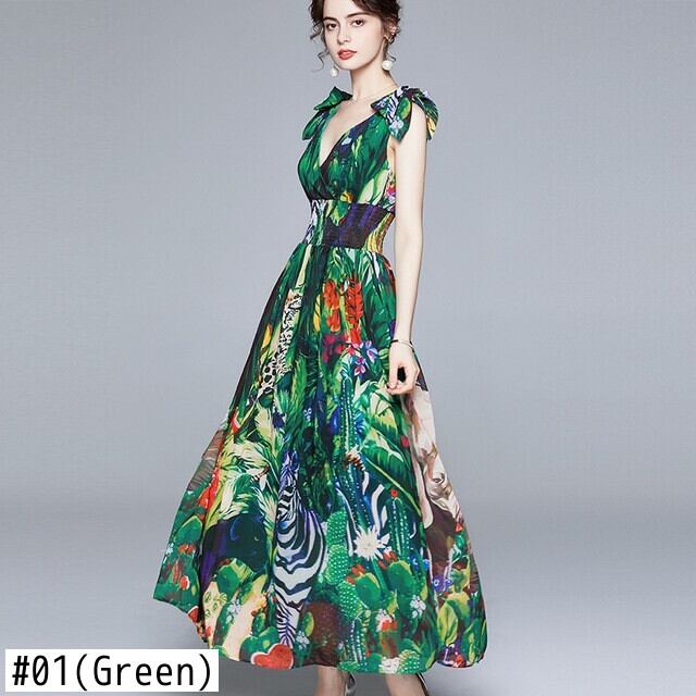 Pinkoz ヴィンテージ トロピカル Rainest プリント v ネック レース アップ ハイウエスト シフォン マキシ ドレス スリム ノースリーブ ボウ パーティー ボヘミアン ドレス ハイウェスト ピンク リボン Vネック レースアップ ビンテージ