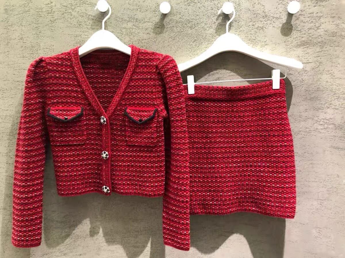 Pinkoz 滑走路デザイナー女性赤 v ネック花ボタン シングル ブレスト ショート カーディガンぬるぬる ミニ スカート 2 点セット女性新しい ピンク レッド Vネック フラワーデザイン