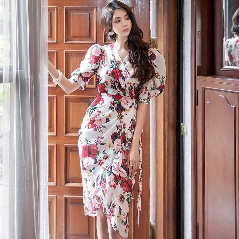 Pinkoz ヴィンテージ パフ スリーブ v ネック シャーリング ミディ ドレス ローズ フラワー プリント ペンシル ストレート ドレス デザイナー スタイリッシュな vestidos traf z ピンク Vネック フラワーデザイン ビンテージ