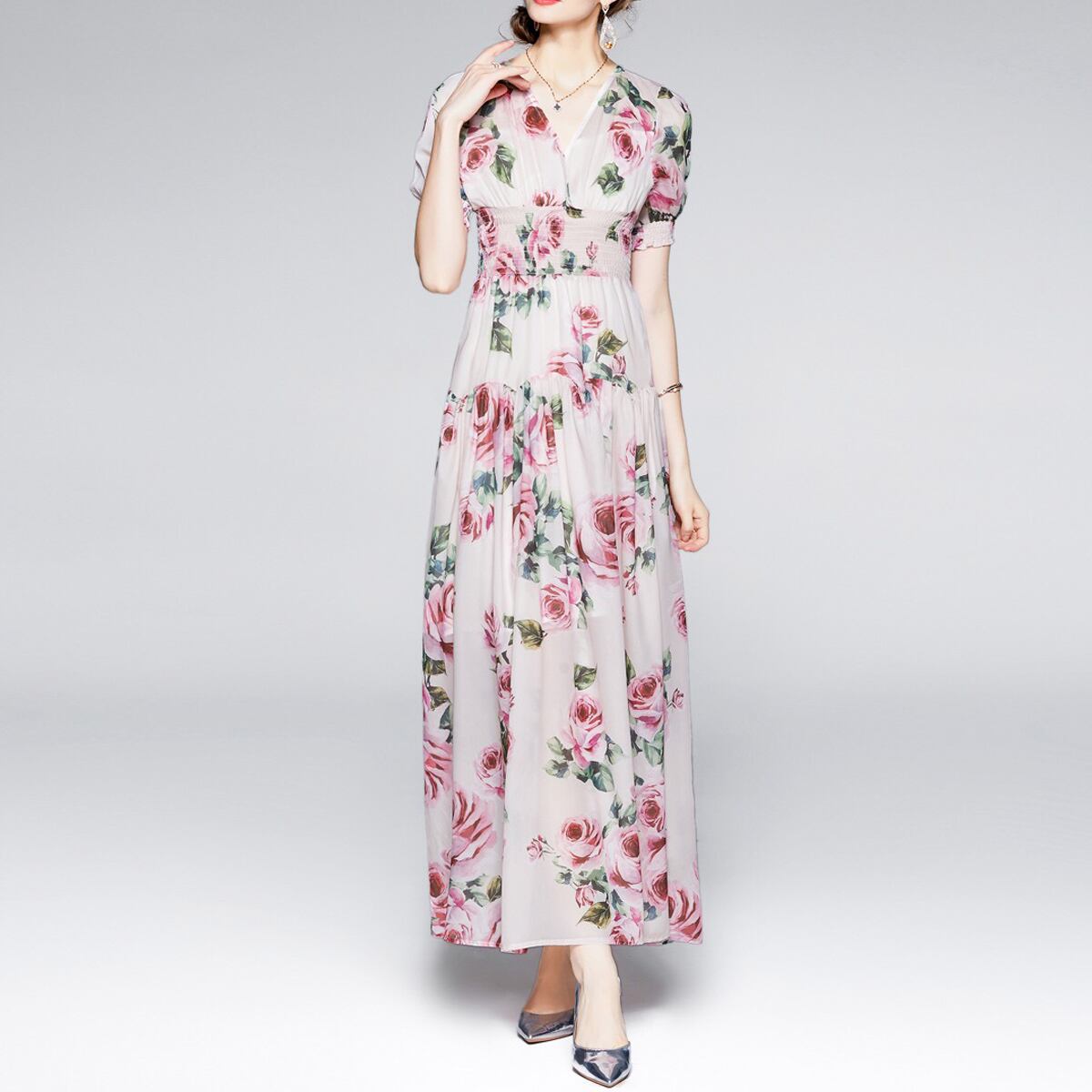 Pinkoz 女性マキシドレスピンクのバラの花プリント v ネック弾性ウエストシフォン自由奔放に生きるファッションロングドレスファムパーティー vestidos 新 エラスティック 伸縮 Vネック フェミニン フラワーデザイン
