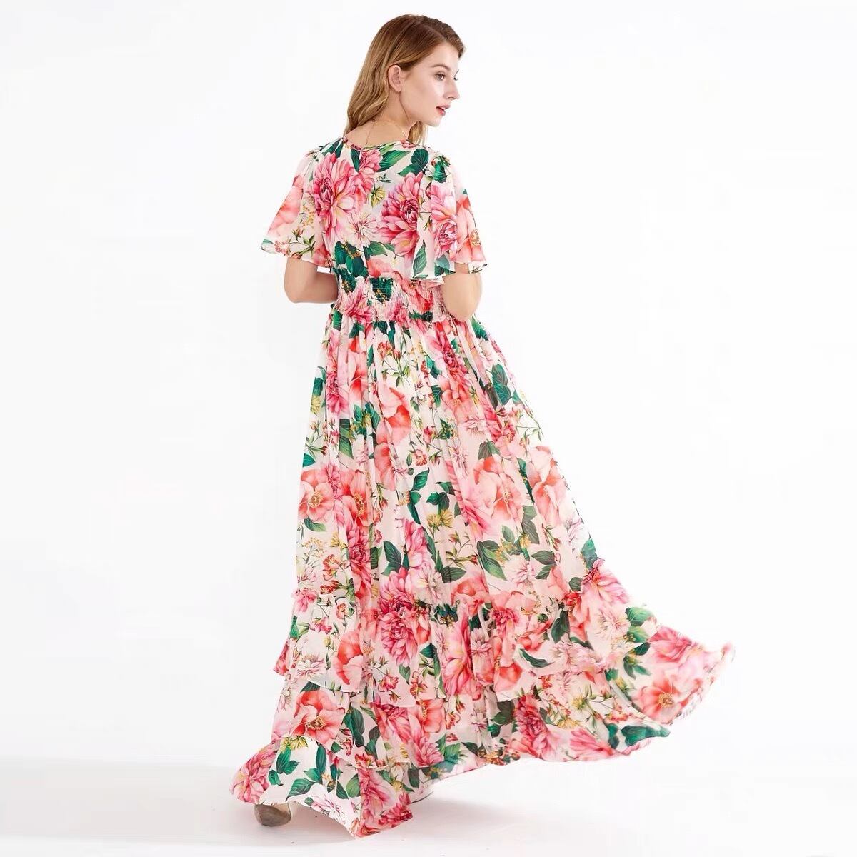 Pinkoz 夏マキシドレス女性滑走路 V ネック弾性ウエストフリル花柄シフォンロングパーティードレス Vestidos ピンク ラッフル エラスティック 伸縮 サマー 夏物 Vネック