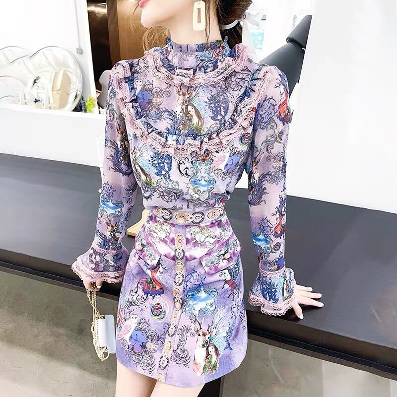 Pinkoz 滑走路 2 ピースショーツセット女性スタンドカラー長袖パープルトップスとウエストフリル裾ショーツレーススーツ Y2K ショート ロング ピンク ラッフル ブルマー