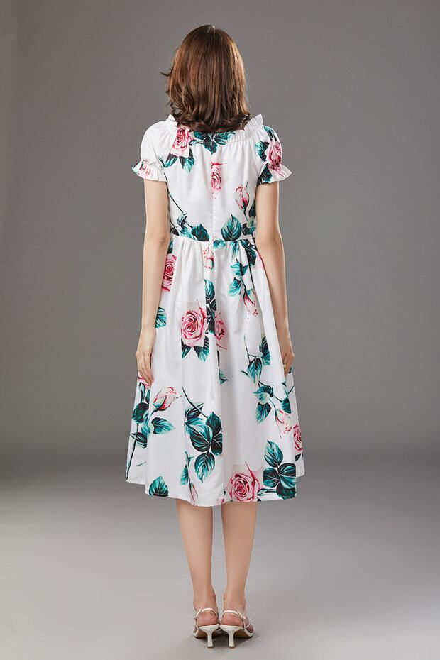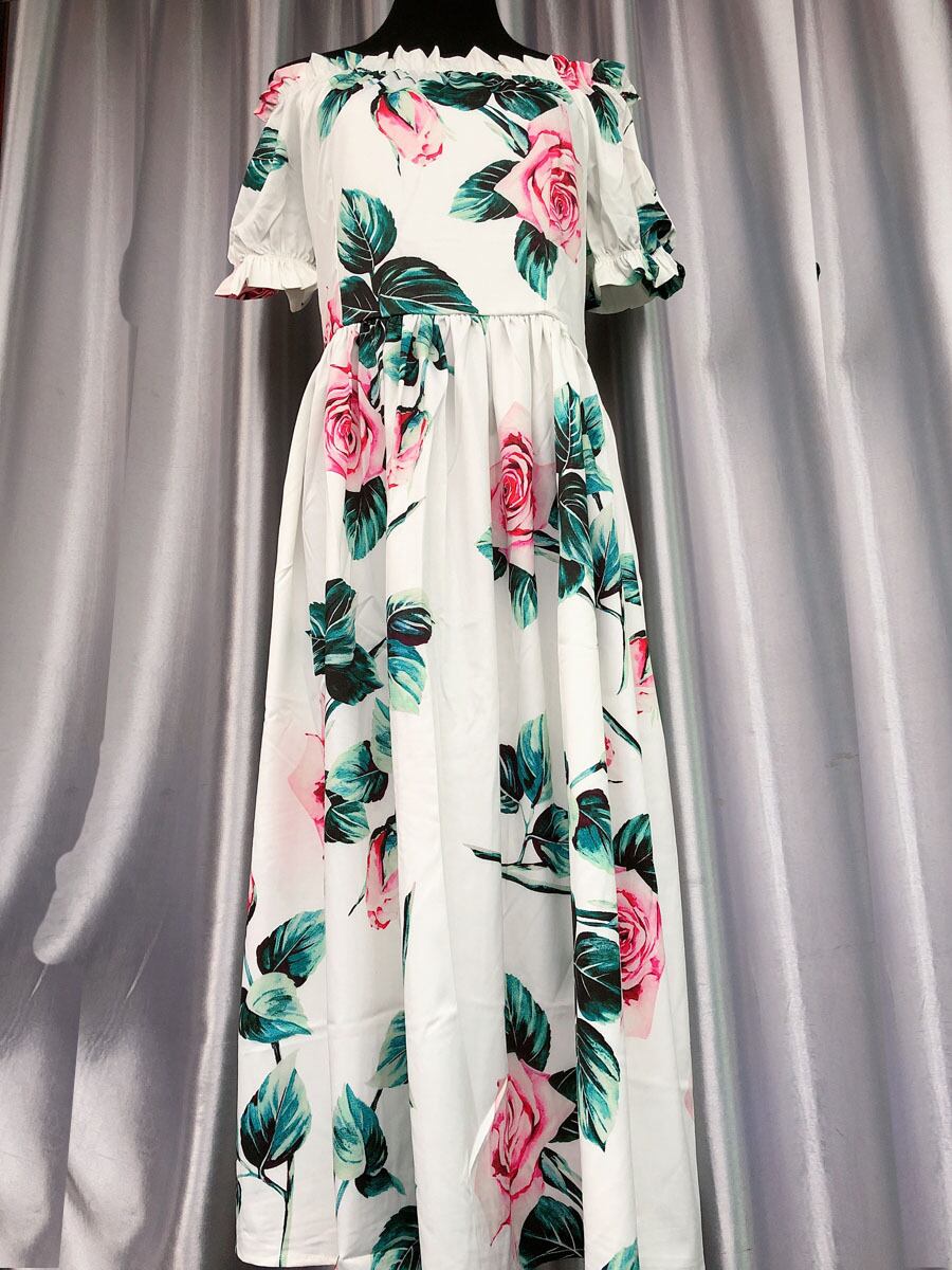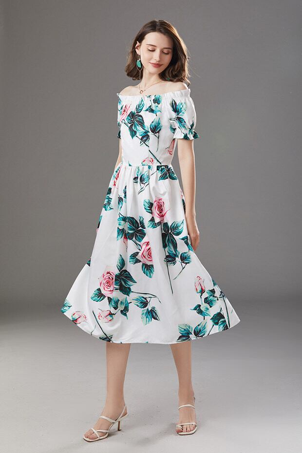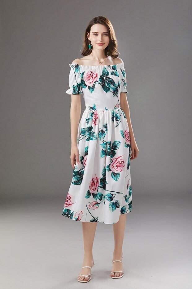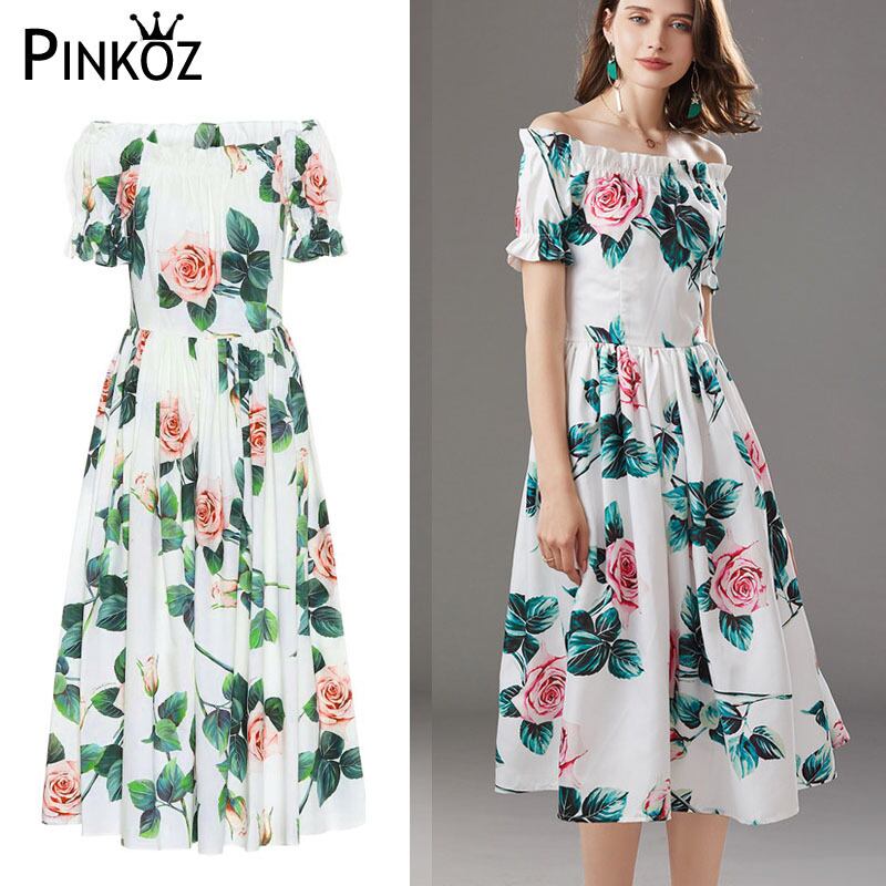 Pinkoz ローズ プリント スラッシュ ネック ミディ ドレス ハイ ウエスト フローラル エレガント ホワイト サマー ドレス ビーチ ドレス vestidos de fiesta de noche ハイウェスト ピンク 夏物 花柄