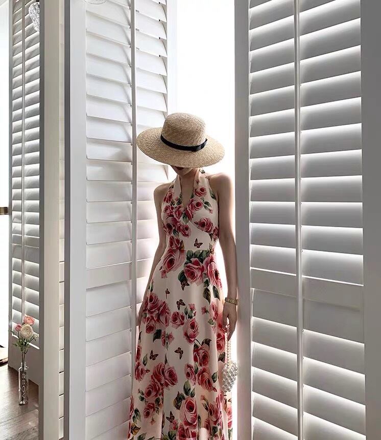 Pinkoz ホリデー シックなバラの花プリント ピンク自由奔放に生きるハイ ウエストぬるぬる背中の開いたセクシーなドレス A ライン スリーブ ホルター ローブ デ mujer traf ハイウェスト Aライン フラワーデザイン