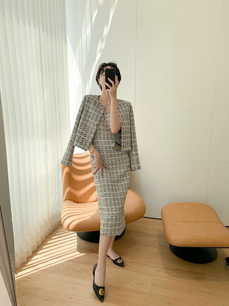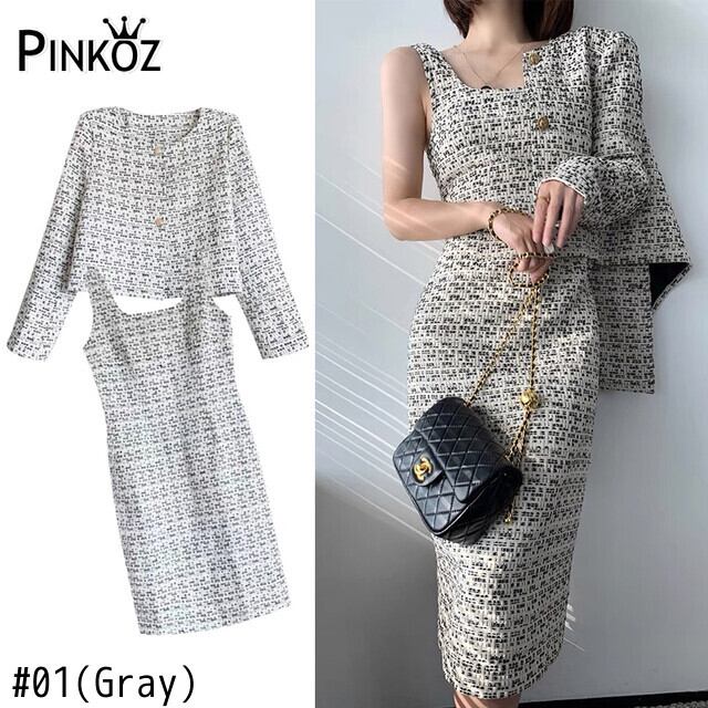 Pinkoz 秋冬女性 2 点セット グレー チェック柄ショート ジャケット シングル ブレスト エレガントな千鳥格子ツイード衣装 traf vestidos ピンク オータム 秋物 ウィンター 冬物