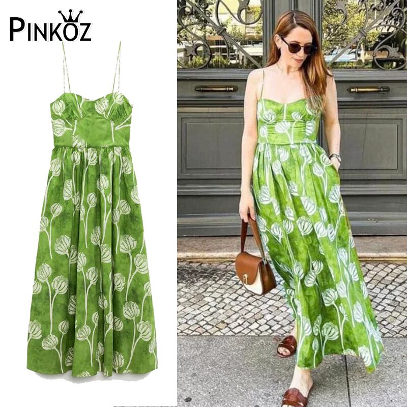 Pinkoz 滑走路デザイナースパゲッティストラップ夏秋マキシドレスキャミソール花柄プリントぬるぬるセクシーなロングドレス vestidos 自由奔放に生きる ピンク サマー 夏物 オータム 秋物