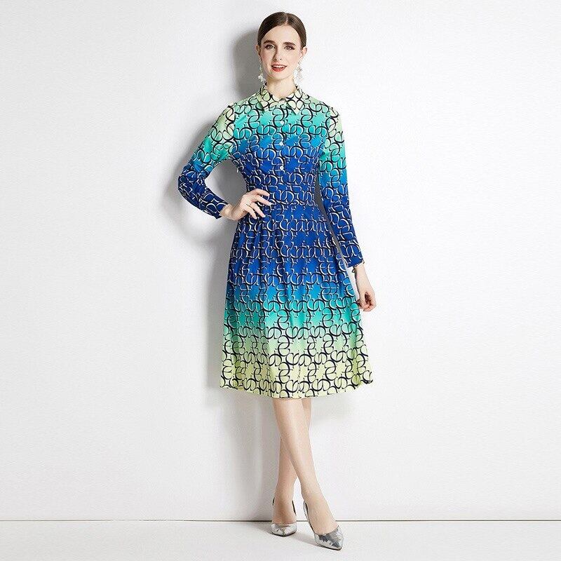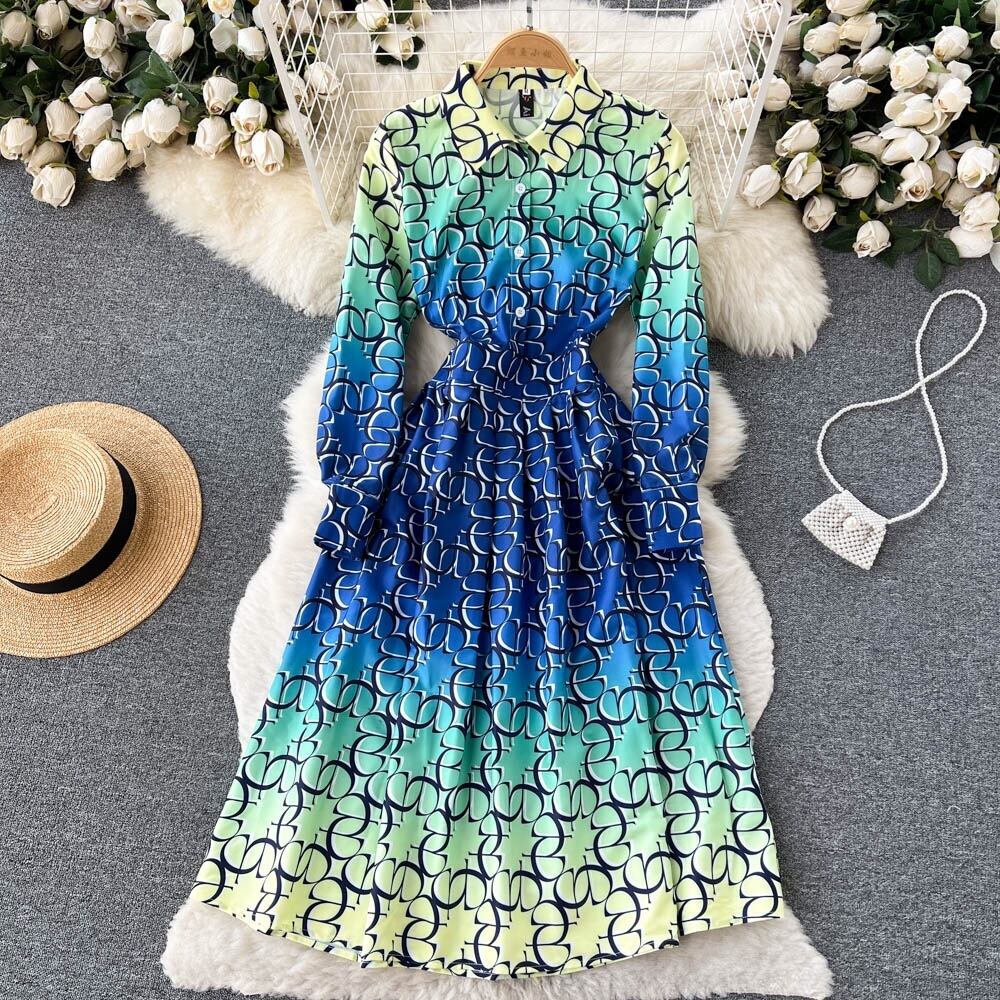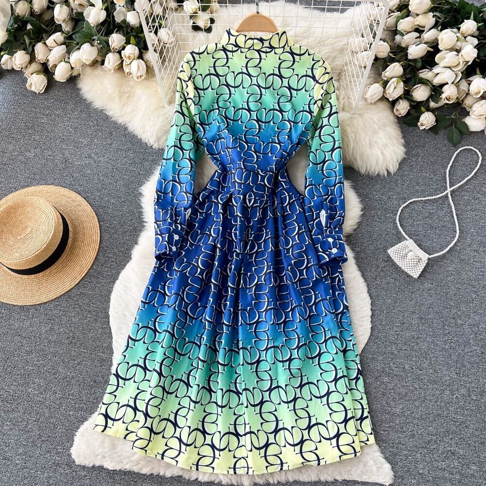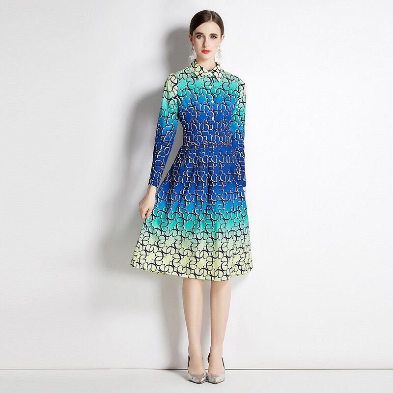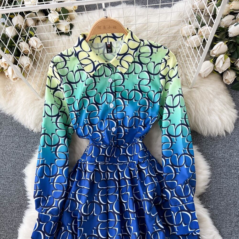 Pinkoz 滑走路デザイナー レター プリント マラカイト ブルー グラデーション ファッション パーティー エレガントな A ライン ドレス ハイストリート服シックな新しい ピンク Aライン