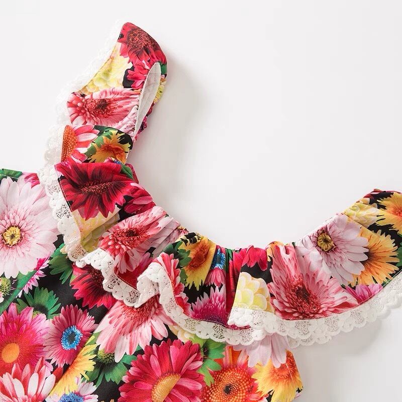 Pinkoz ランウェイ パッチワーク レース シャーリング Uネック ヒマワリ柄 フリル ミディ ドレス サマー ホリデー ローブ デ ムヘール エレガント ヴィンテージ ピンク ラッフル 夏物 フラワーデザイン ビンテージ