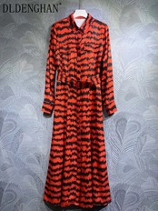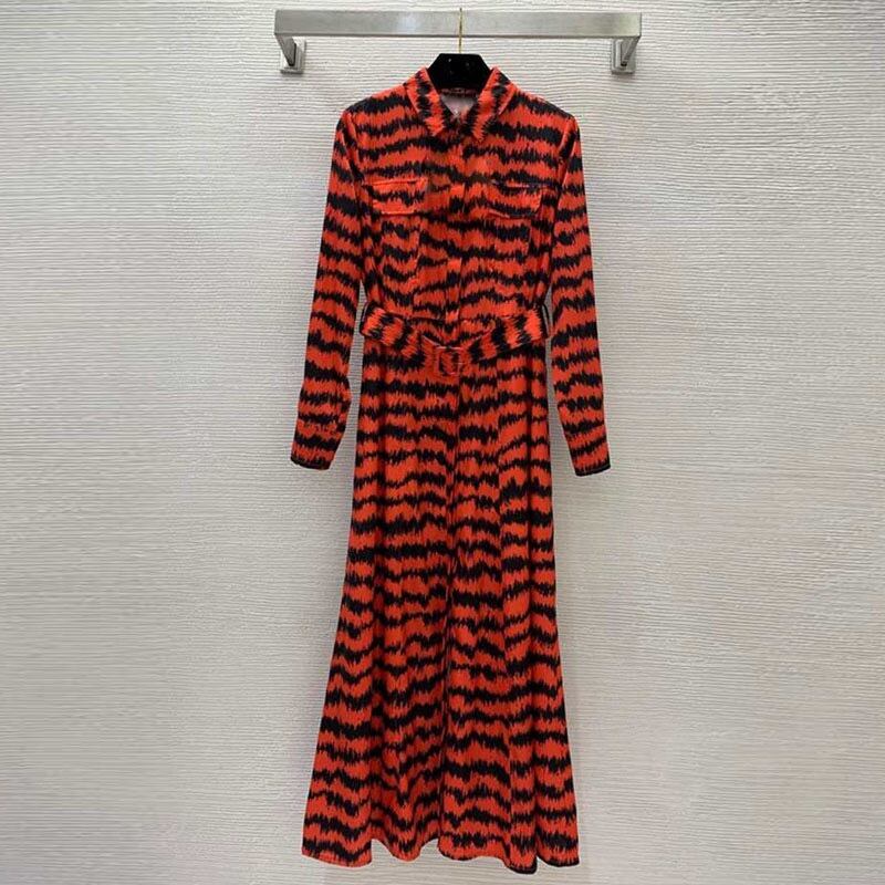 Pinkoz 春夏新ファッションターンダウン襟ミディドレス赤ヒョウ A ラインエレガントなオフィスレディドレスとベルトローブ ピンク レッド スプリング 春物 サマー 夏物 ハーネス Aライン 会社 学校 通勤や通学にも