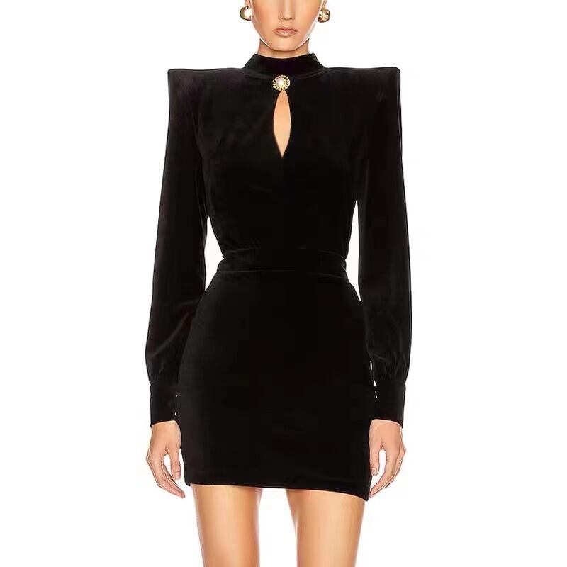Pinkoz 滑走路有名人セクシーなミニドレス女性ファムスリムボディコムワンボタンベルベット赤黒長袖春秋ドレス ロング ピンク レッド ブラック スプリング 春物 オータム 秋物 フェミニン