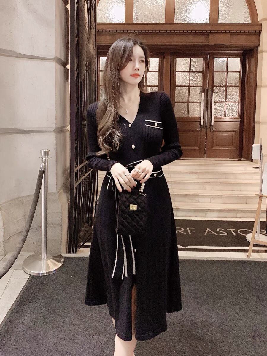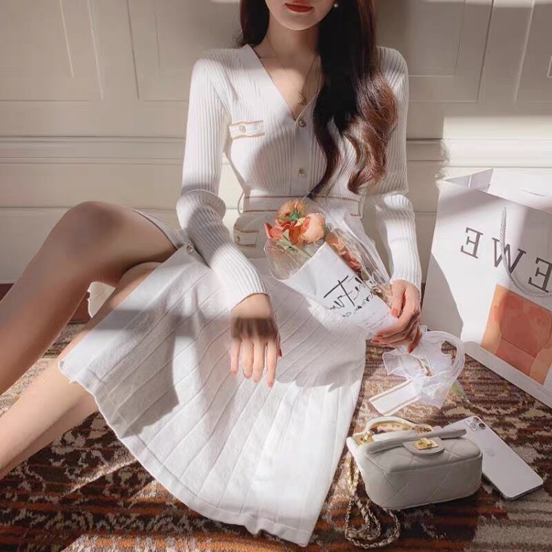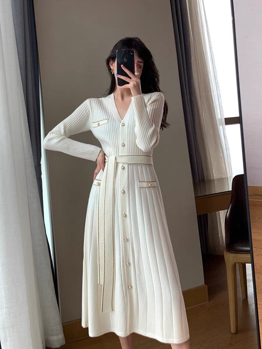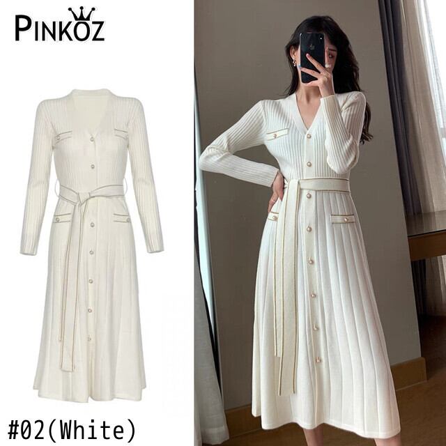 Pinkoz 韓国ファッション白シングル ブレスト v ネック ニット ミディ ドレス女性ボタン サッシ レース アップ a ライン プリーツ vestido ピンク ホワイト Vネック Aライン レースアップ