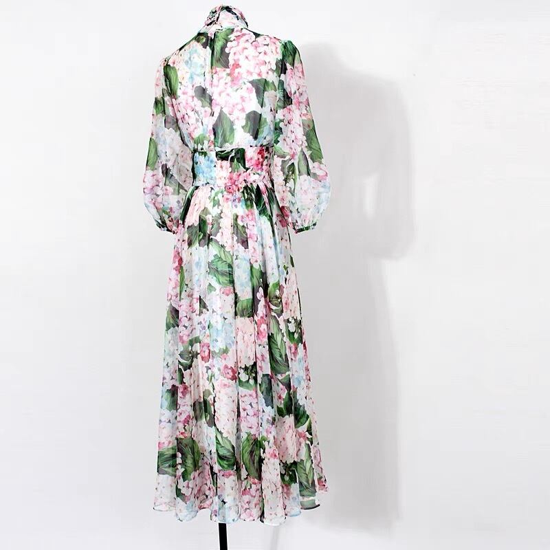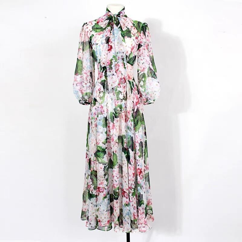 Pinkoz 夏滑走路シフォン ロング ドレス女性の長袖花柄パーティー休日ドレス vestidos ピンク サマー 夏物