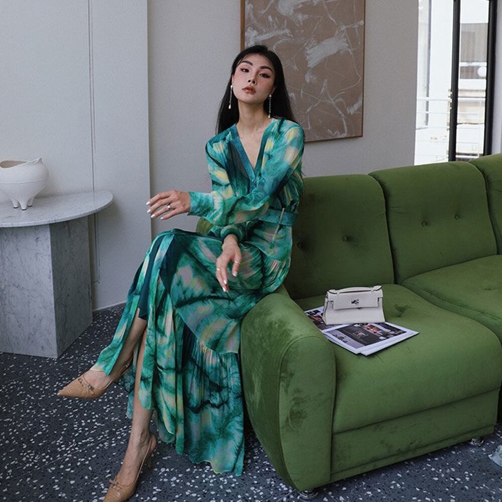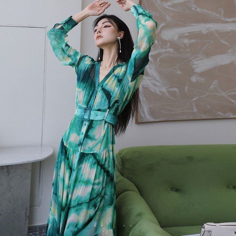 Pinkoz 女性デザイナー シングル ブレスト グリーン花柄プリント シフォン マキシ ドレス春秋ランタン スリーブ ファッション vestidos ピンク ランタンスリーブ スプリング 春物 オータム 秋物