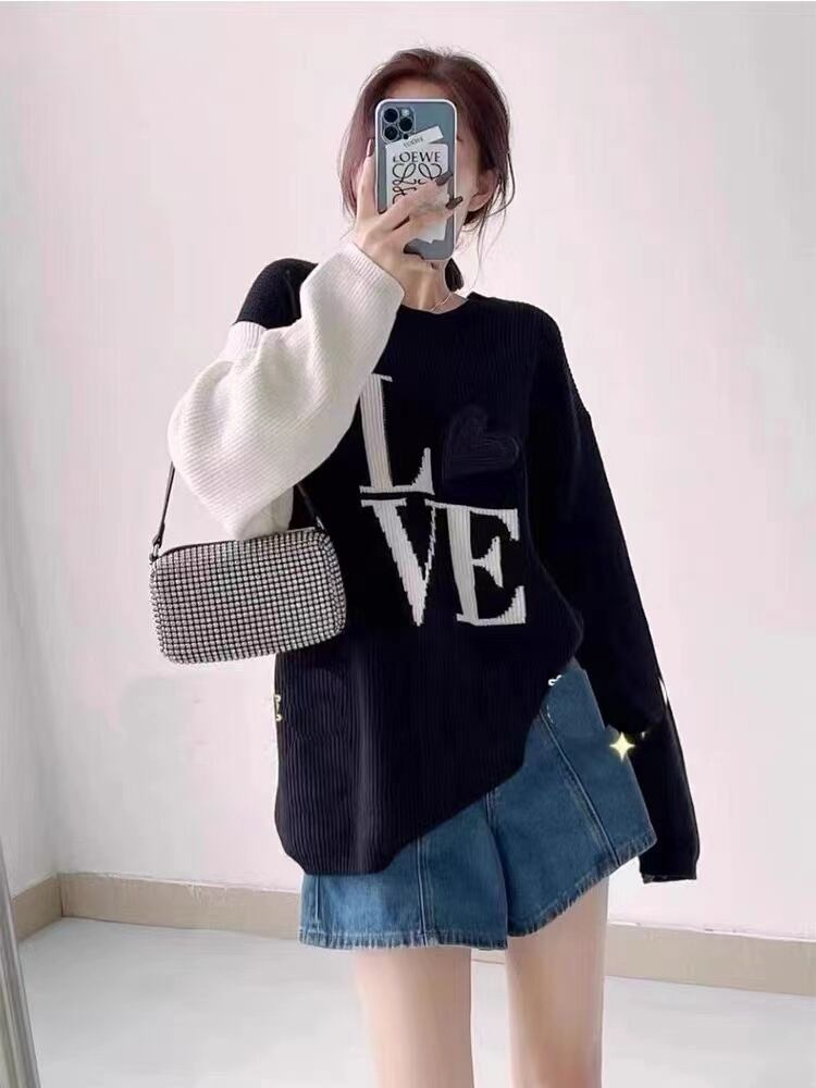 Pinkoz レディース ルースセーター ピンク レター ハートラブ Oネック 長袖 ニット トップス プルオーバー 秋冬物 カジュアルトップス za ロング オータム 秋物 ウィンター