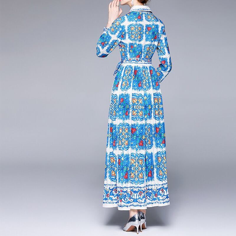 Pinkoz 女性の青と白の花柄プリント マキシ ドレス ターン ダウン襟シングル ブレスト秋冬プラス サイズ ドレス サッシ za ピンク ホワイト ブルー 大きめサイズ オータム 秋物 ウィンター 冬物
