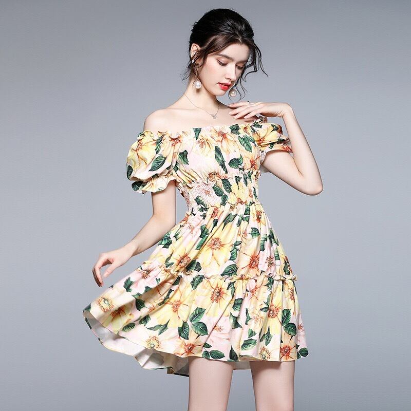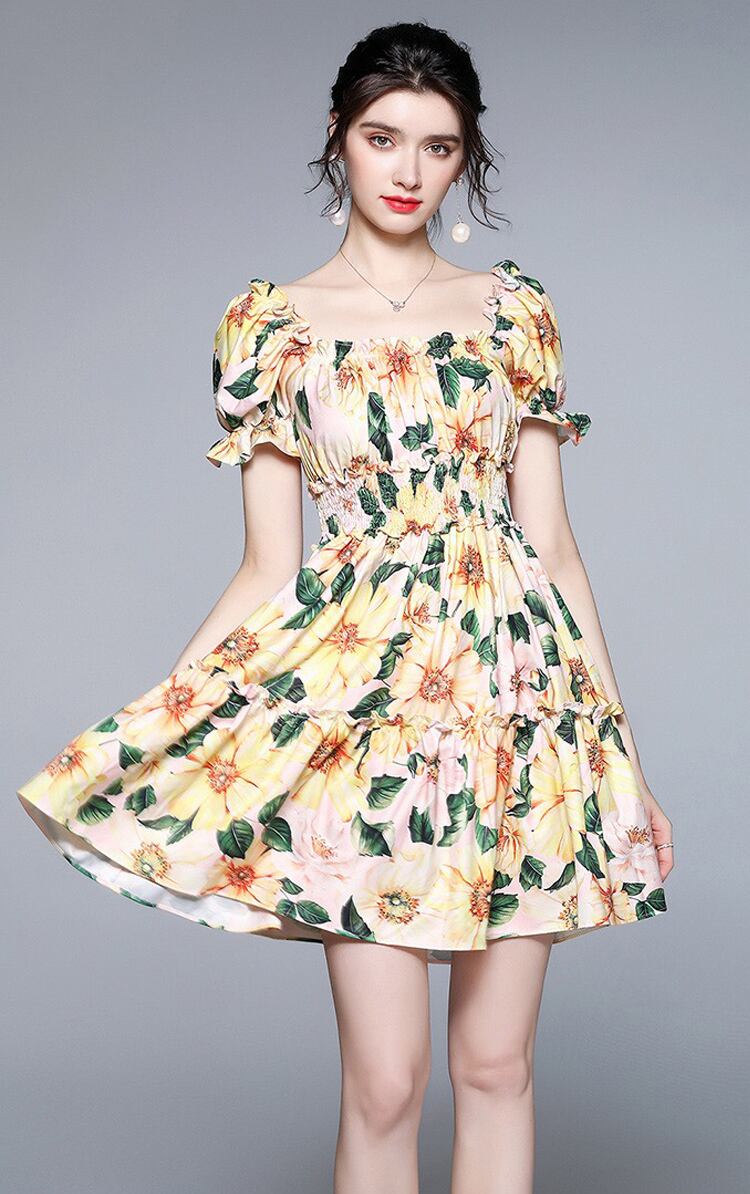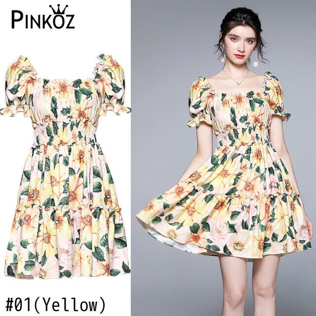 Pinkoz 夏ミニドレスシャーリング スラッシュネックセクシーなパーティー休日椿の花プリント A ラインカジュアルプラスサイズのドレス vestidos ピンク 大きめサイズ サマー 夏物 Aライン フラワーデザイン