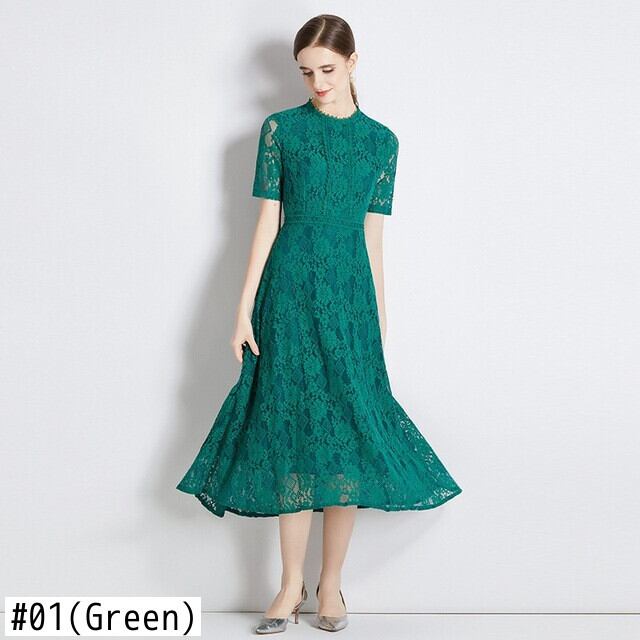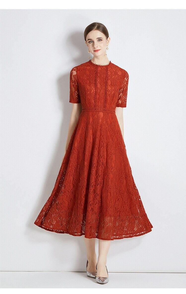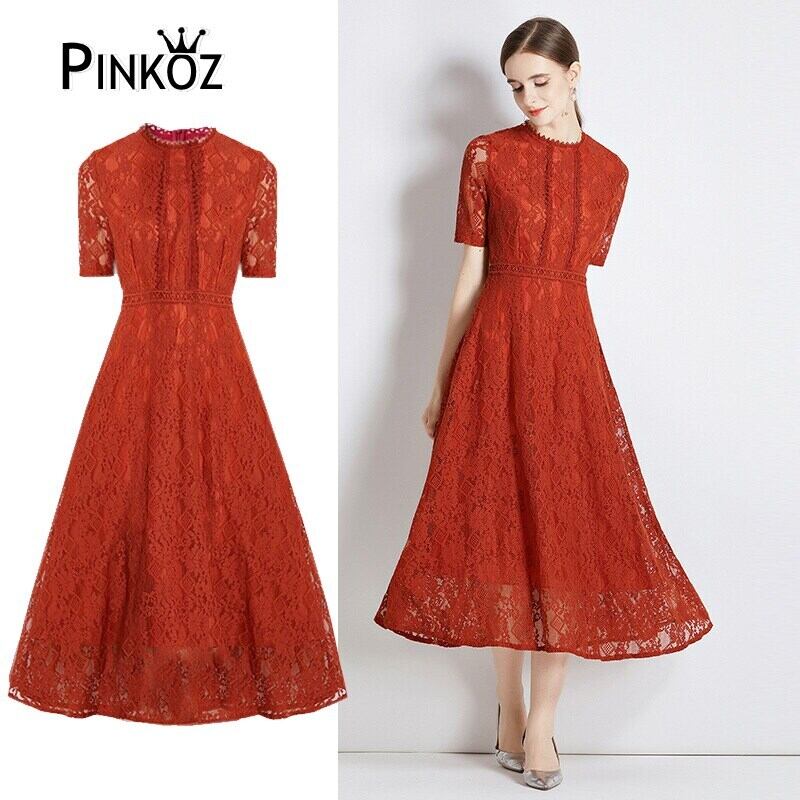Pinkoz エレガントな赤いレースの女性のドレス o ネック半袖夏オフィス レディー スリム ハイ ウエスト OL シックなローブ デ mujer ヴィンテージ vestido ハイウェスト ショート ピンク レッド ハーフスリーブ サマー 夏物 Oネック ビンテージ 会社 学校 通勤や通学にも