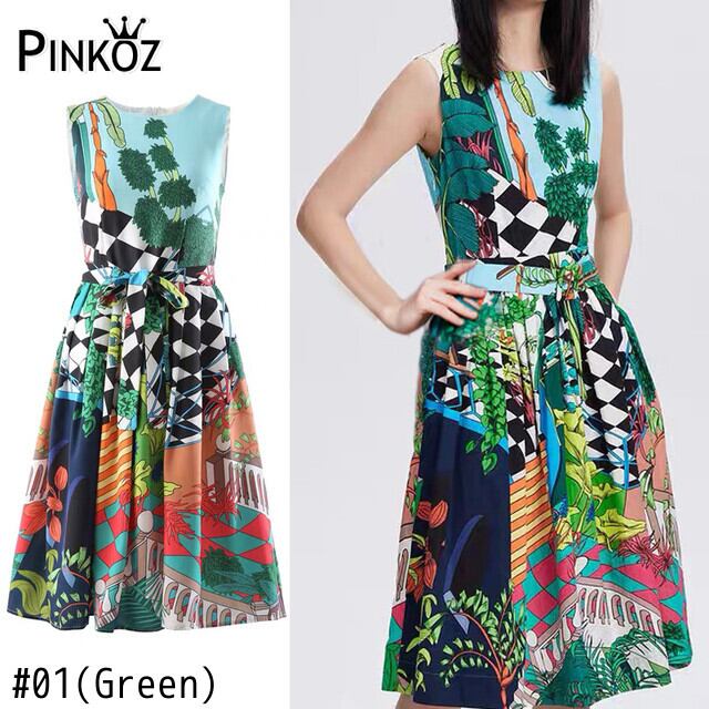 Pinkoz 女性デザイナー グリーン花柄 o ネック ノースリーブ ミディ ドレス自由奔放に生きるレースアップ サッシュ夏 vestidos ヴィンテージ シックな traf ピンク サマー 夏物 Oネック ビンテージ