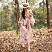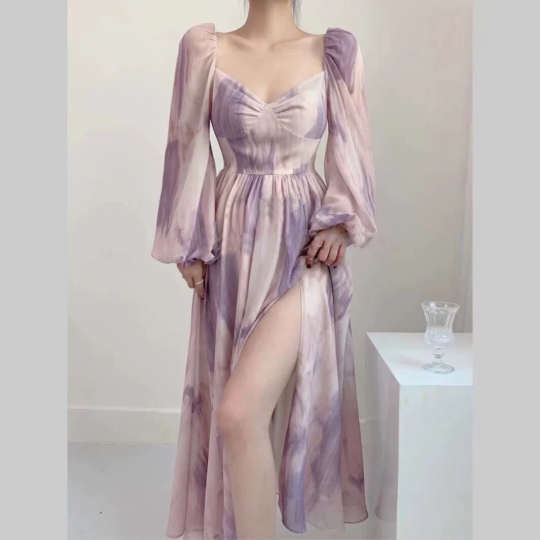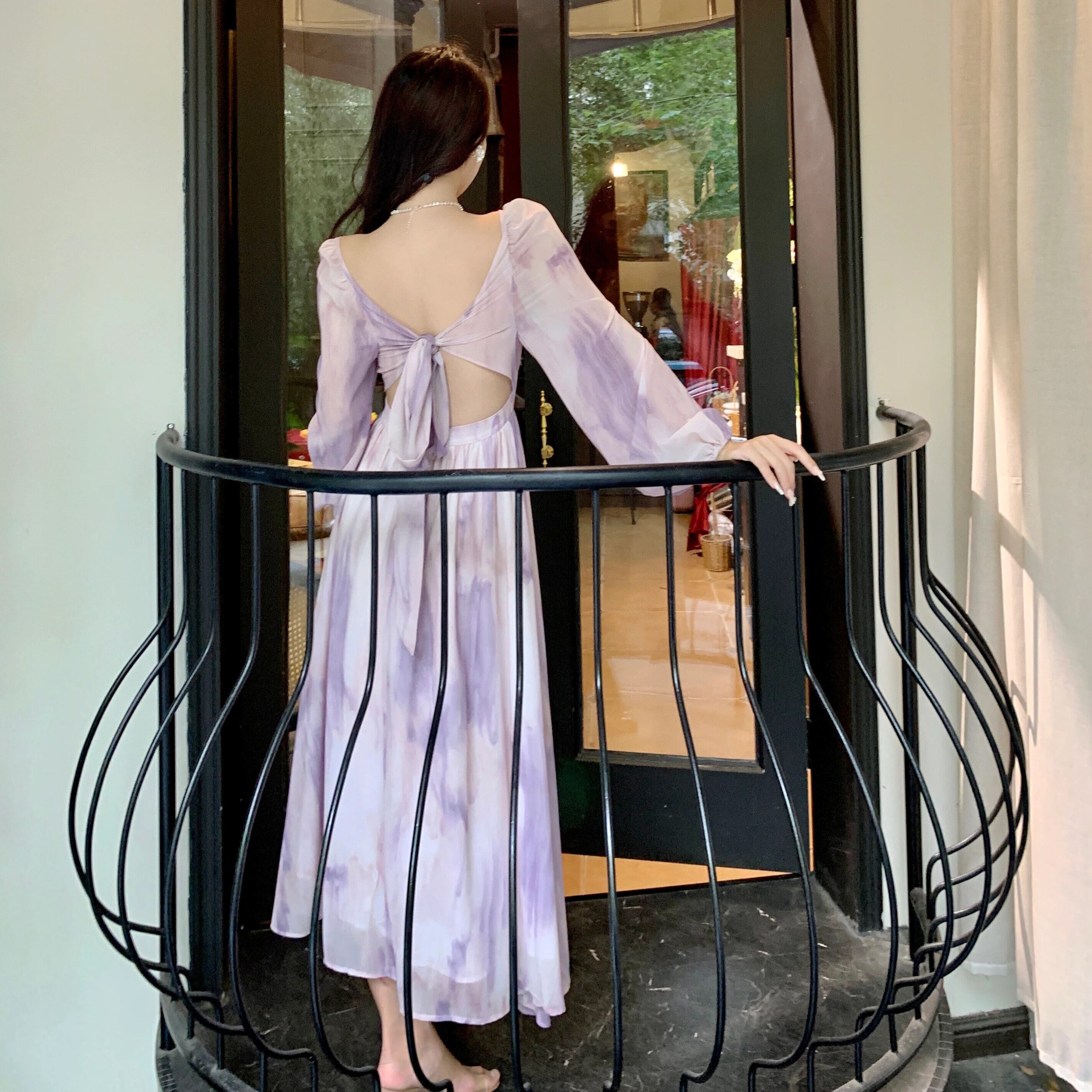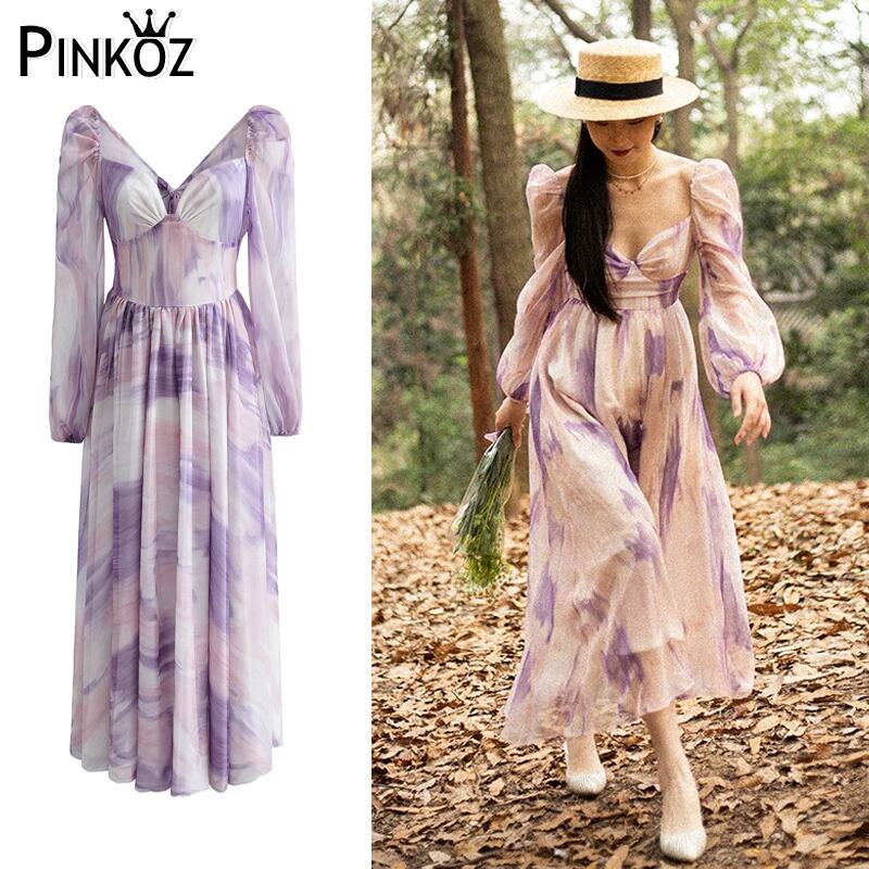 Pinkoz 女性バイオレット プリント スクエア カラー長袖ドレス背中の開いた中空アウト レースアップ弓シフォン ヴィンテージ ビクトリア朝の vestidos ロング ピンク リボン スクウェア ビンテージ