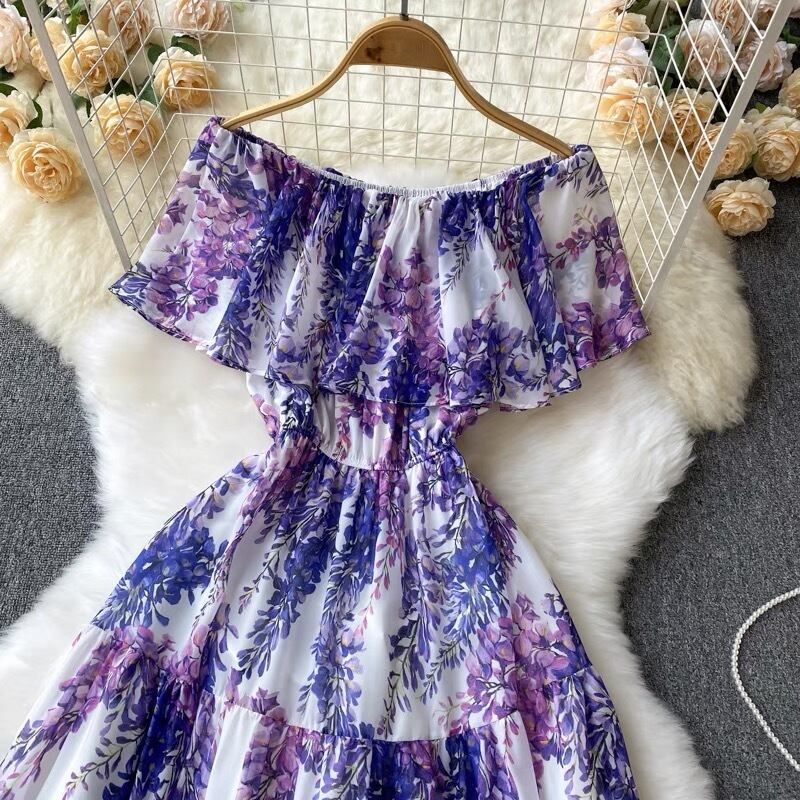 Pinkoz 女性デザイナー スラッシュ ネック フリル マキシ ドレス シフォン自由奔放に生きるロング ドレス夏カジュアル ビッグ サイズ vestidos ヴィンテージ ファッション ピンク ラッフル サマー 夏物 ビンテージ