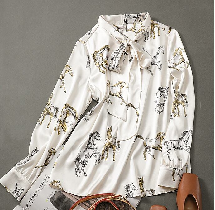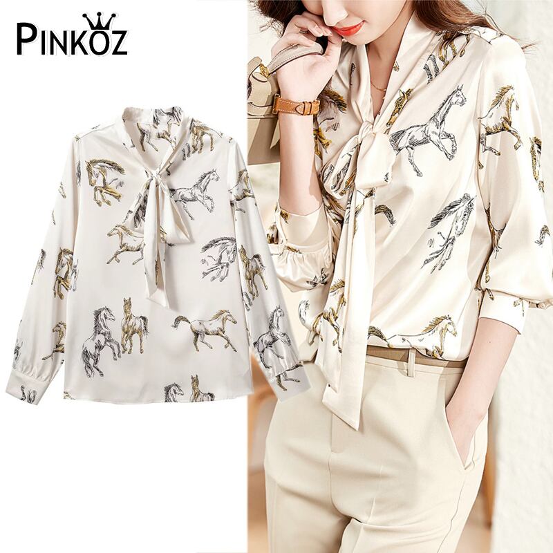 Pinkoz 女性デザイナー スタイリッシュなヴィンテージ パリ馬アニマル柄プリント ボウ カラー シングル ブレスト ブラウス roupas femininas traf ピンク リボン フェミニン ビンテージ