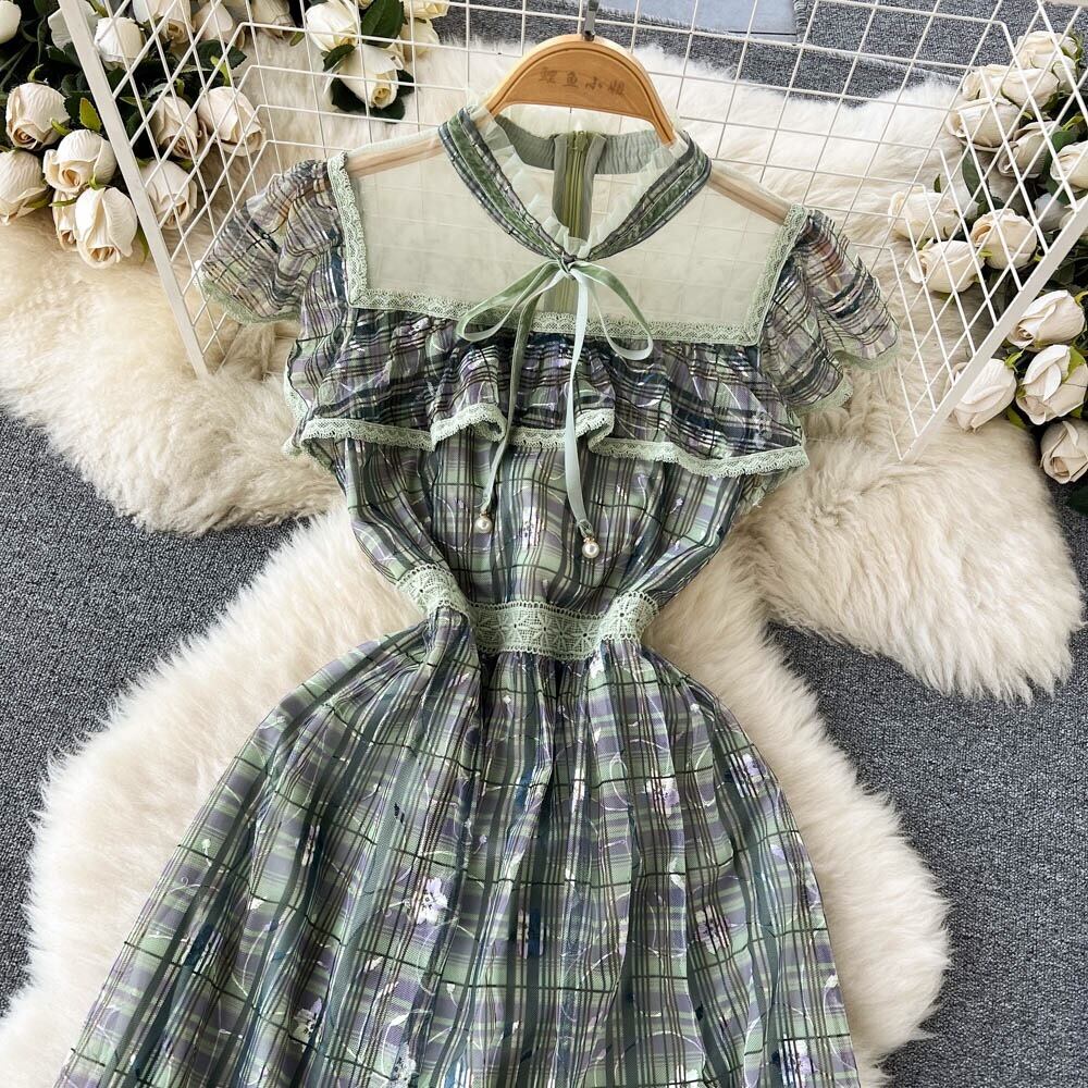 Pinkoz 女性グリーン チェック柄パッチワーク レース夏休みシックなロング ドレス エレガントなヴィンテージ ローブ デ mujer vestidos ファム ファッション traf ピンク サマー 夏物 フェミニン ビンテージ